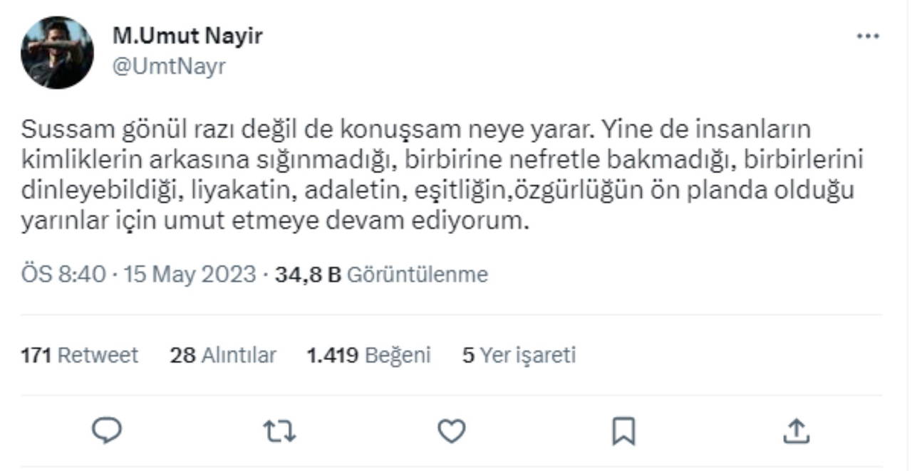 Umut Nayir, Twitter hesabı üzerinden yaptığı paylaşımda, "Sussam gönül razı değil de konuşsam neye yarar. Yine de insanların kimliklerin arkasına sığınmadığı, birbirine nefretle bakmadığı, birbirlerini dinleyebildiği, liyakatin, adaletin, eşitliğin,özgürlüğün ön planda olduğu yarınlar için umut etmeye devam ediyorum" ifadelerini kullandı.