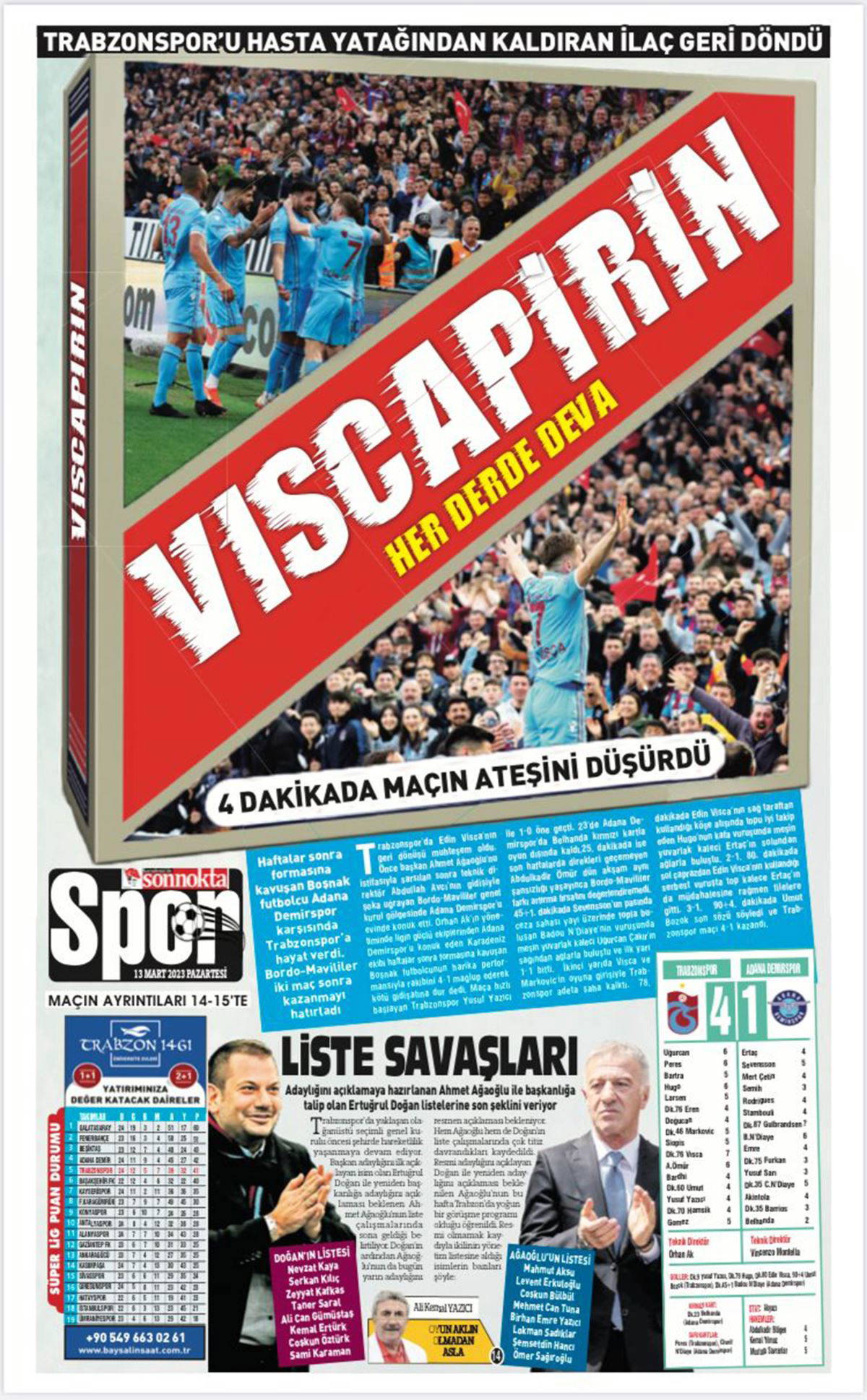 Kentte yayın yapan gazeteler, bordo mavili takımın galibiyetini sayfalarına taşıdı. Edin Visca ve Marek Hamsik’in geri dönüşünün takımı olumlu yönde etkisini, ‘Trabzonspor’u hasta yatağından kaldıran ilaç geri döndü, Viscapirin her derde deva’, ‘Dikkat Edin ustalar döndü, böyle fırtınaya 41 kere maşallah’, ‘Visca, Hamsik geri döndü, fırtına ayağa kalktı, Kalite asla tesadüf değildir’, ‘Boşnak yıldız Edin Visca bir döndü pir döndü, Akyazı’da fırtına koptu’, ‘Yıldızlar fark yarattı’ başlıklarıyla manşetlerine taşıdı.
