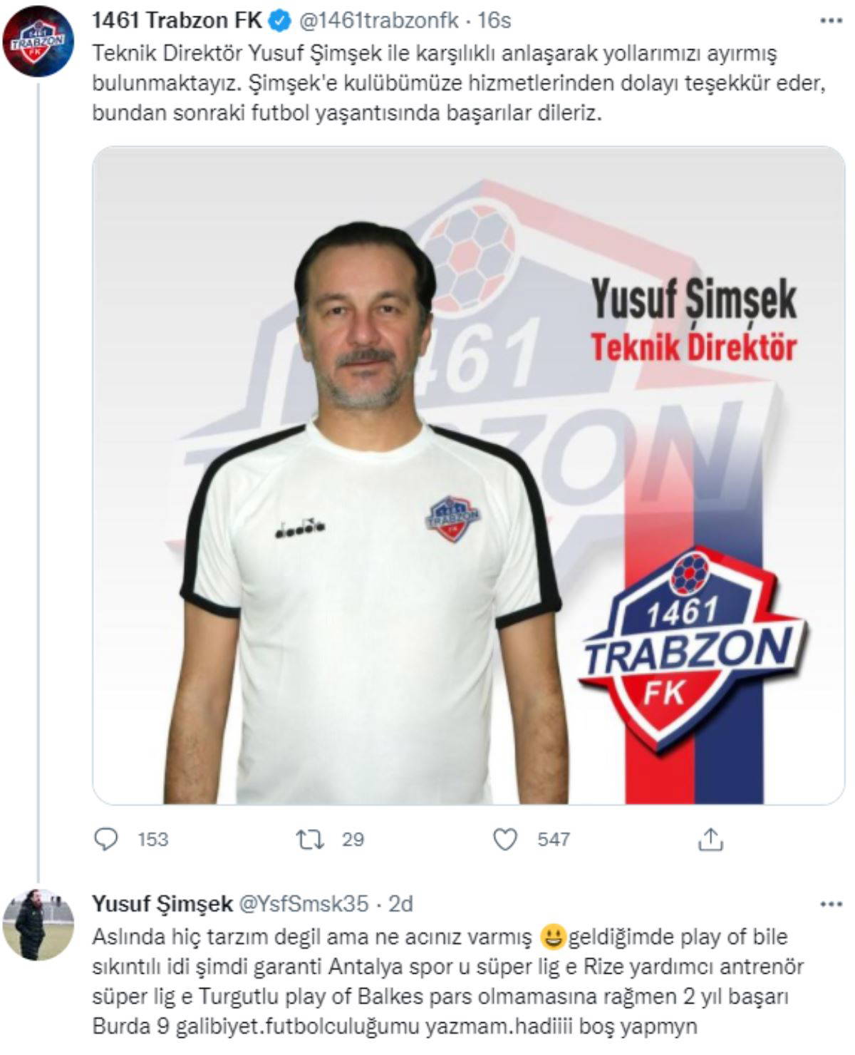 Türkiye 2. Lig Kırmızı Grup'ta şampiyonluk mücadelesi veren fakat son 2 haftada aldığı mağlubiyetlerle lider Sakaryaspor'un 7 puan gerisine düşen ve bitime 5 maç kala 1. Lig'e direkt yükselme ihtimali oldukça azalan 1461 Trabzon FK, teknik direktör Yusuf Şimşek ile yollarını ayırdı.