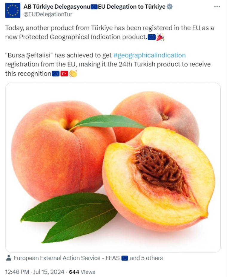 ‘Bursa Şeftalisi’, AB'den coğrafi işaret tescili alarak bunu alan 24. Türk ürünü oldu” denildi.