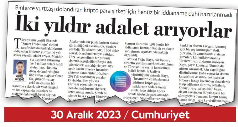 Cumhuriyet daha önce birçok yurttaşın “Sıfır risk ile yüksek kazanç” vaadiyle, “Smart Trade Coin” isimli kripto varlık alım satım platformu üzerinden dolandırıldığını gündeme getirmişti.