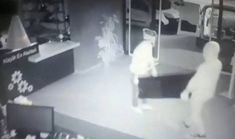 Görüntülerde, şüphelilerden birinin servise ait aracı iş yerinin önüne getirmesi ve daha sonra çaldıkları kasaları alarak iş yerinden ayrıldığı görülüyor.