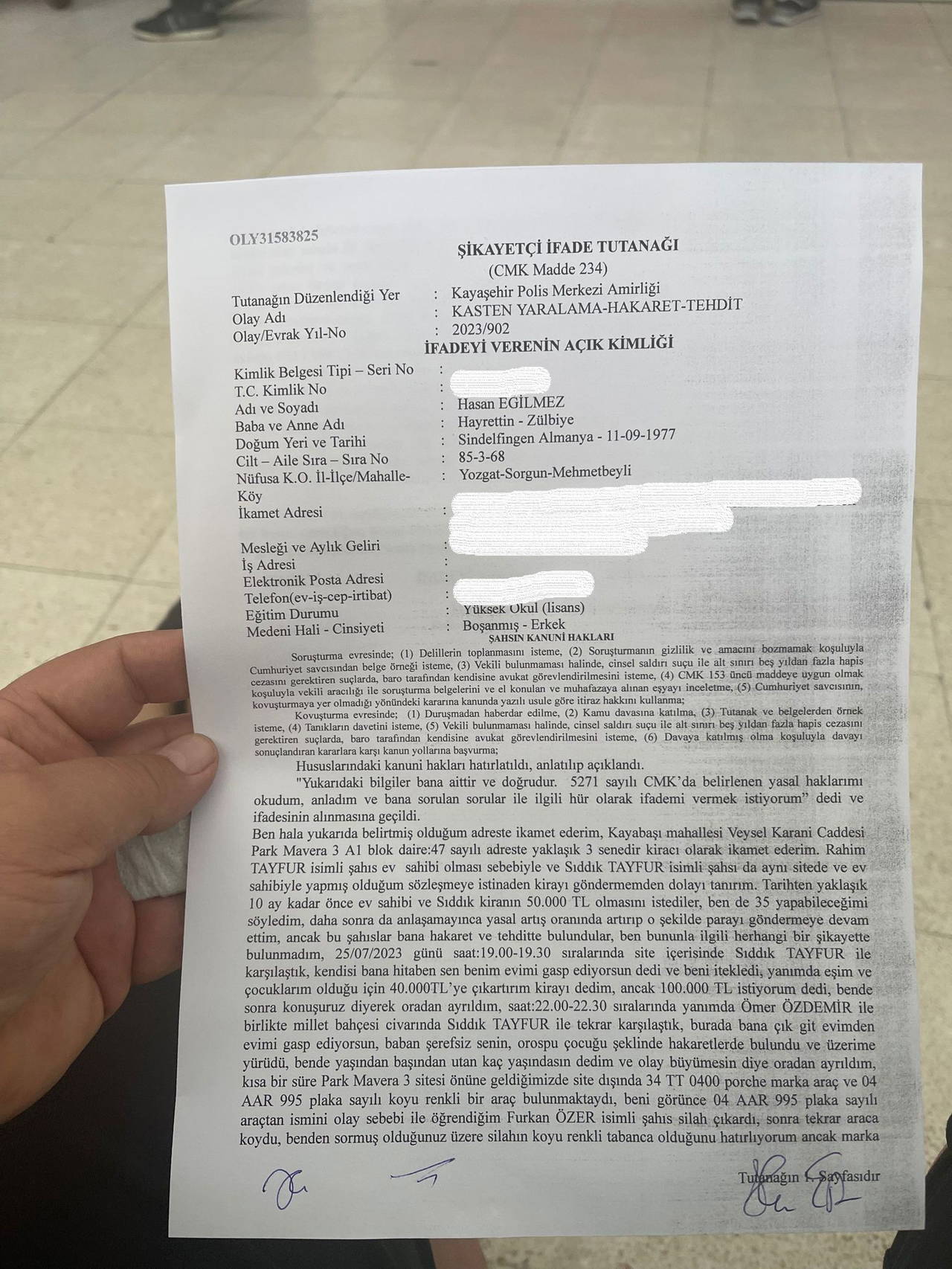 "Bu süreçte tabii ki eve kapıya dayanmalar devamlı telefonda arayışlar bizi dışarıda gördüklerinde sesli sesli bağırmalar. İnsanların içinde bir taraftan da rezil etme peşindelerdi kendileri. Olay dün büyümeye başladı. Dün akşam saat 19.30 sıralarında çocuklar parkta oynuyordu. Bizim 1 buçuk yaşında bir kızımız var. Bir oğlumuz var 8 yaşında. Bunları ben eve götürürken karşılaştık. Çünkü onlar da aynı blokta kaldıkları için tekrar yine bu kira konusunu açtı. Her zaman her gördüğünde açtığı gibi. 'Tamam anlaşırız, konuşuruz' dedim hani görüşürüz bunu tekrar dedim. 'Yok şimdi görüşeceğiz' dedi. Ben 'Verdiğim teklif geçerli' dedim. 'Yok ben 100 bin lira istiyorum' dedi. Bir de bunun üstünde durdu. 'Yoksa gidersin buradan, ayrılman gerekiyor' dedi. Ben, 'Burada çocuklar var dedim hoş değil bu yaptığınız' dedim.