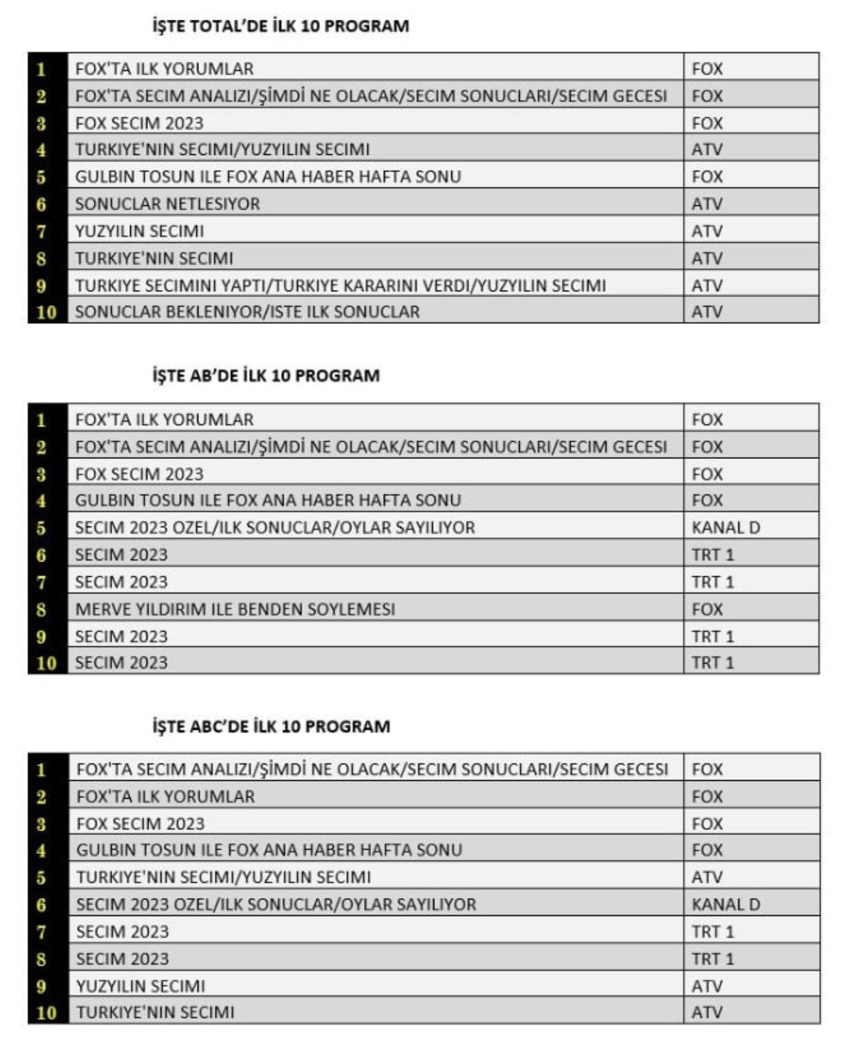 AB'de de "Fox'ta İlk Yorumlar" programı birinci sırada yer alırken, ikinci sırayı yine "Fox'ta Seçim Analizi/Şimdi Ne Olacak/Seçim Sonuçları/Seçim Gecesi" programı aldı. Üçüncü sırada ise "Fox Seçim 2023" programı yer aldı.