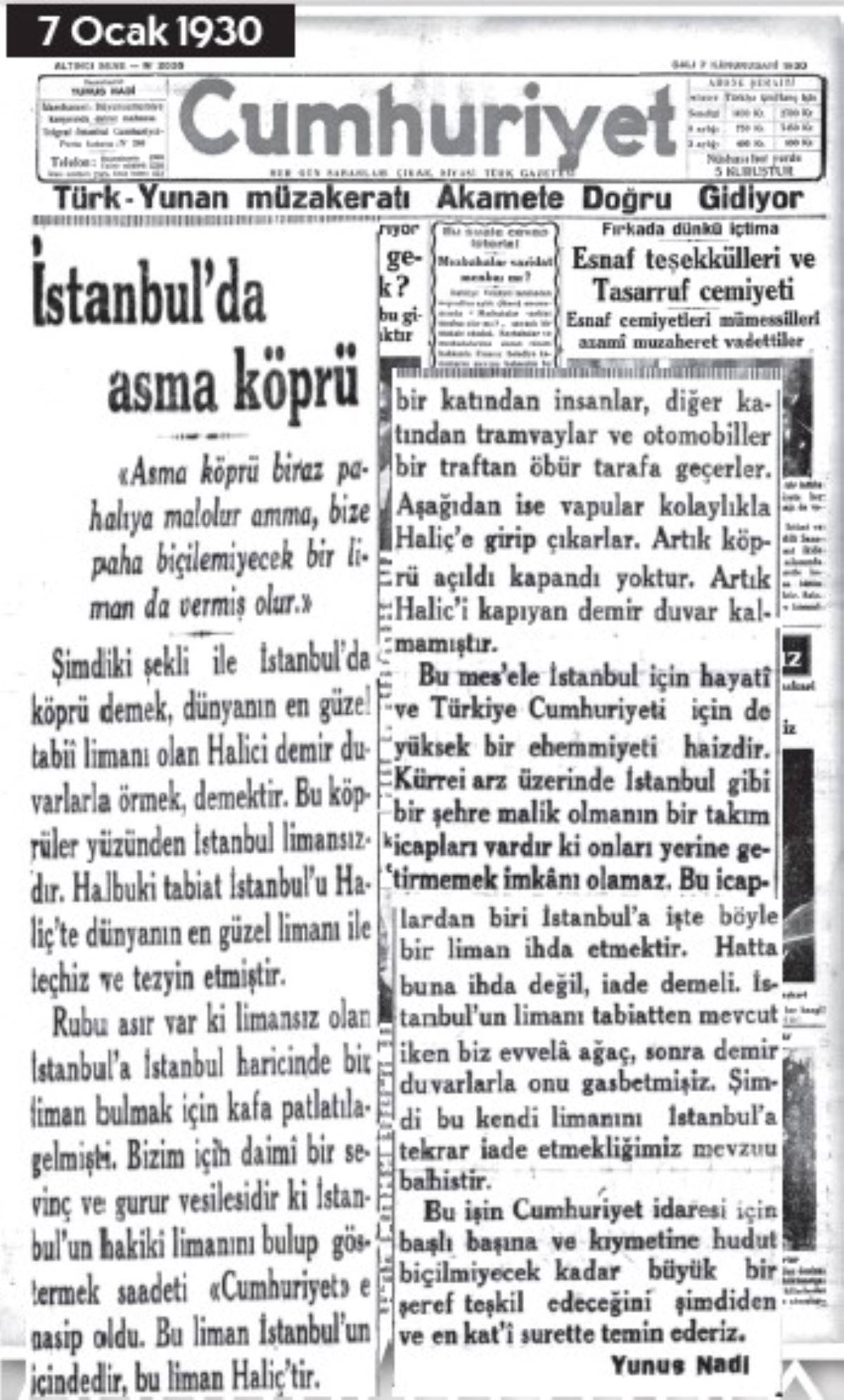 Yunus Nadi ise manşetin altında yer alan köşe yazısına doğrudan “İstanbul’da asma köprü” başlığını atmış. “Asma köprü biraz pahalıya mal olabilir amma, bize paha biçilemeyecek bir liman da vermiş olabilir” öngörüsünü eklemiş. “Cumhuriyet yönetimine büyük bir onur, hizmet olabileceği” sonuç görüşüyle imzasını atmış. Yunus Nadi’nin Mustafa Kemal’in önerisi ile İstanbul’daki mandacı basına karşı, Cumhuriyet’in sesi olabilmesi amacıyla, Cumhuriyet gazetesini İstanbul’a Cağaloğlu’na taşıdığı, yayın yaşamını sürdürdüğü gerçeği de gözetilince, “İstanbul’a asma köprü”nün aynı zamanda Mustafa Kemal’in de düşü olduğu sonucu çıkarılabilir.
