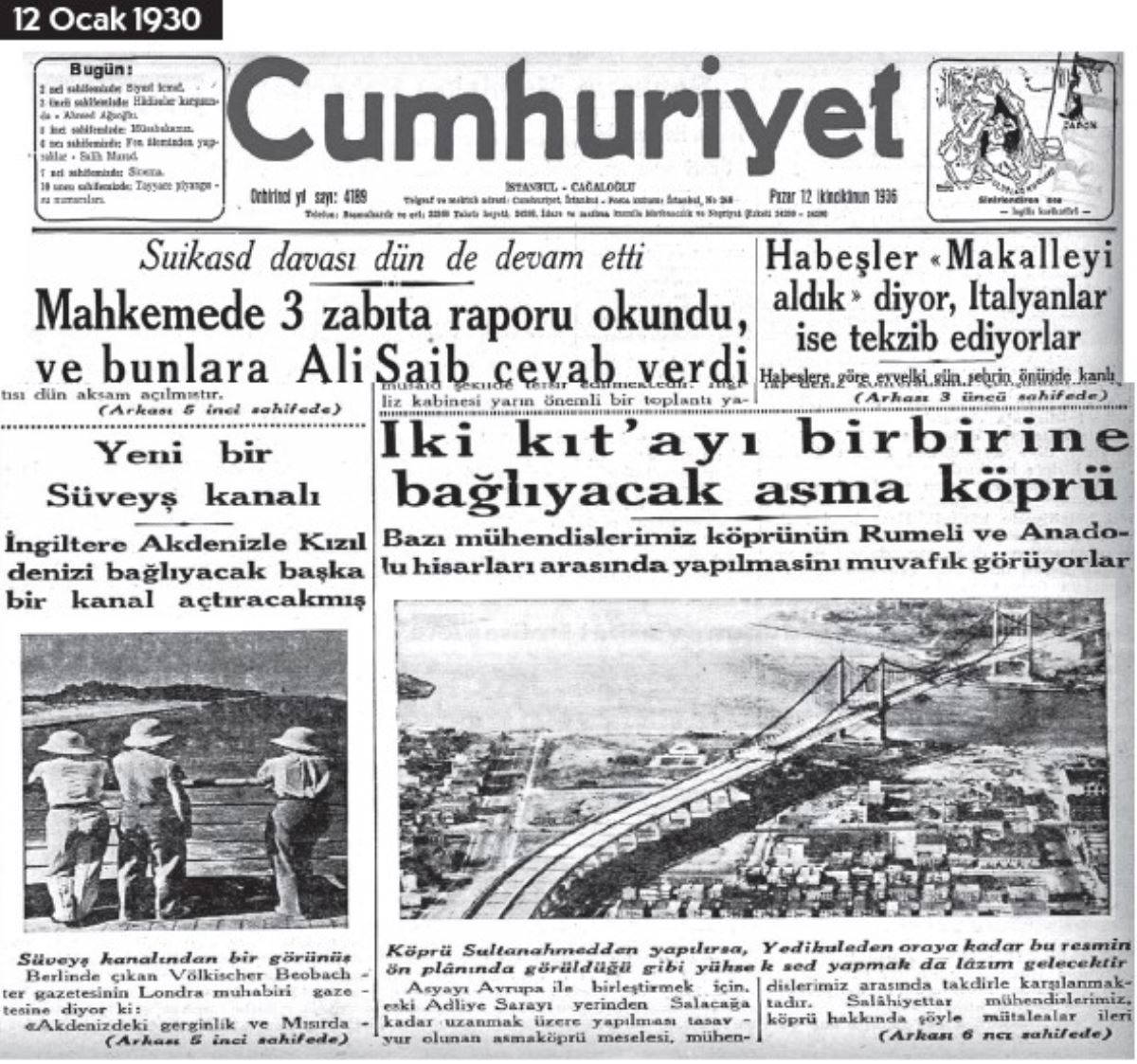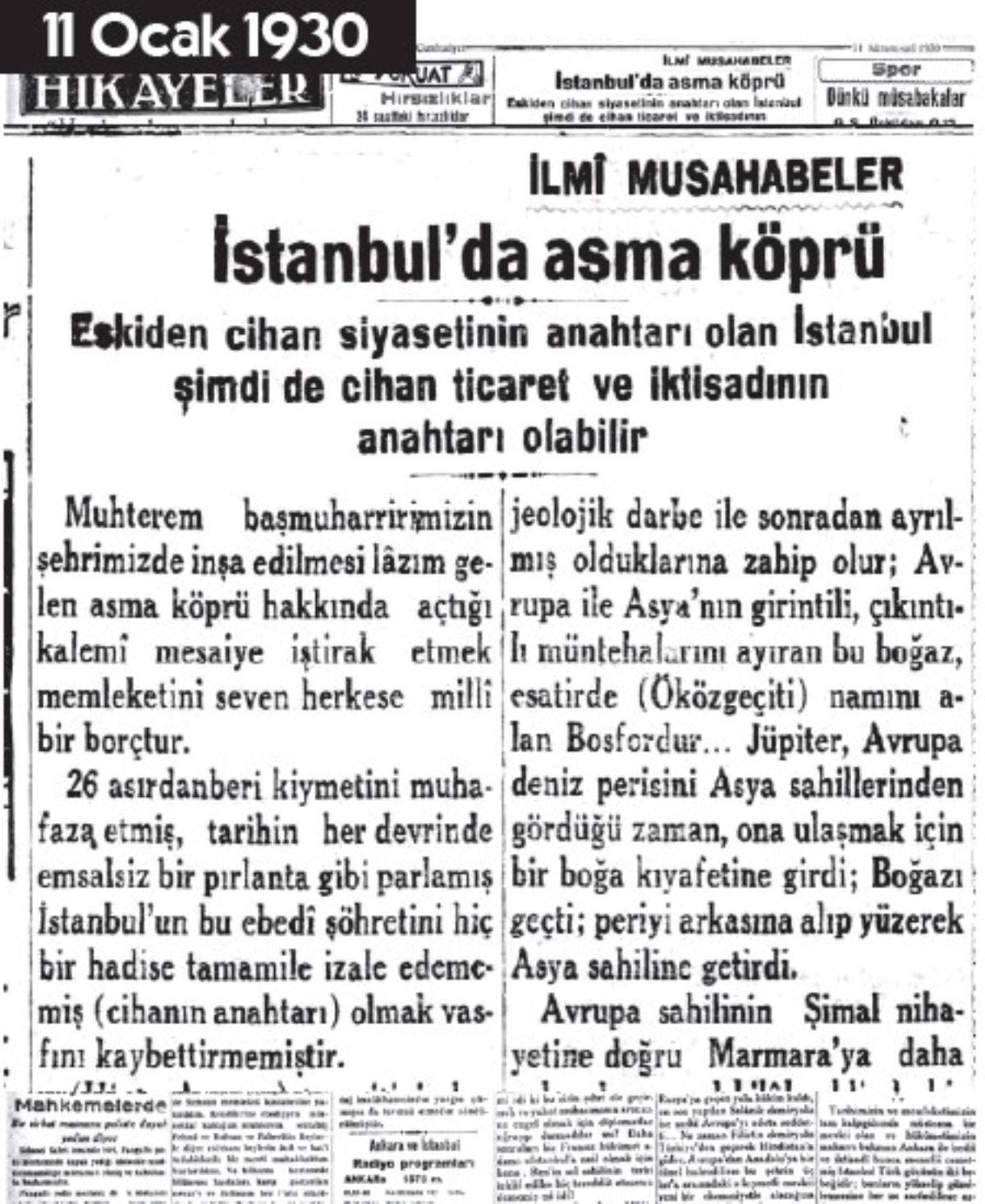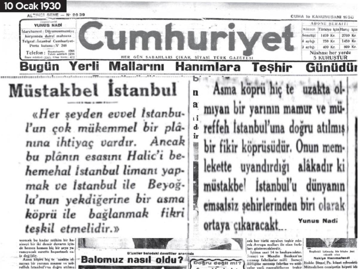 11 Ocak tarihli Cumhuriyet’in 3. sayfasında Yunus Nadi ile yapılmış bir söyleşi üzerinden yayımlanan değerlendirme yazısında, yine “İstanbul’da asma köprü” başlığı altında görüşleri özetlenirken “Eskiden cihan siyasetinin anahtarı olan İstanbul şimdi de cihan ticareti ve iktisadının anahtarı olabilir” saptamasına yer verilir. Dünyanın en güzel kentlerinden biri olarak kültürel değerlerinin korunması, geliştirilmesi yanında, Avrupa ve Asya’yı birbirine bağlayan işlevinin önemi üzerinde duruluyor.
