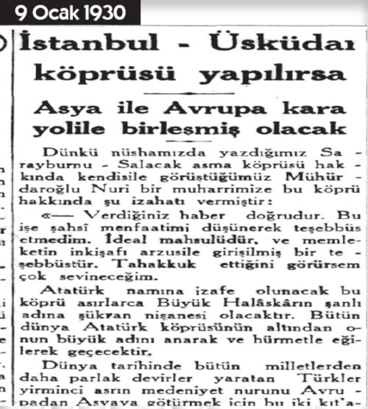 Hemen arkasından 10 Ocak 1930 tarihli 1. sayfada yayımlanan köşesinde “Müstakbel İstanbul” başlığı altında İstanbul’un öncelikle mükemmel bir plana ihtiyacı olduğunun altını çiziyor. İstanbul gibi bir şehrin yalnızca bir istasyonu olamayacağını sorguluyor. Şimendiferlerin (demiryolarının) Yedikule’den önce ve sonra izleyecekleri bir hat ile şehre yapılacak asma köprüye dahil edilerek hem Beyoğlu hem de asma köprü üzerinden Boğaz’ı da atlayarak Anadolu’ya geçmelerinin yolunun bulunmasının bir düş olmadığının altını çiziyor. Gazi’nin adına yaraşacak bir asma köprünün yapılmasına ilişkin düşüncelerini pekiştiriyor..