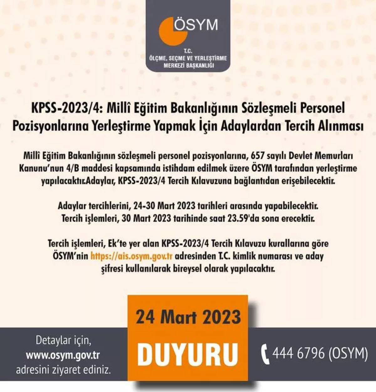 Tercih işlemleri, Ek’te yer alan KPSS-2023/4 Tercih Kılavuzu kurallarına göre ÖSYM’nin https://ais.osym.gov.tr adresinden T.C. kimlik numarası ve aday şifresi kullanılarak bireysel olarak yapılacaktır. Adayların tercih işlemleri için kılavuzu dikkatlice incelemeleri gerekmektedir.