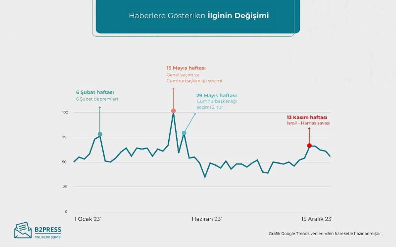 1 Ocak-15 Aralık 2023 tarihlerinde 30 bini aşkın çevrimiçi mecrada yayımlanan 65,9 milyon haberi analiz eden B2Press, dijital basının 2023 özetini açıkladı. Online PR servisi, Dijital Basın Raporu-2023 ile birlikte hakkında en çok haber yapılan olay, durum ve siyasi kimlikleri ortaya koydu. Doğal afetler, seçim haftaları ve uluslararası krizler, kamuoyunun en çok dikkatini çeken haberlere konu oldu. En çok haber, seçimlerin hemen ardından 15 Mayıs haftasında yayınlanırken onu sırasıyla seçimin ikinci turunu takip eden 29 Mayıs haftası ve depremlerin meydana geldiği 6 Şubat haftası izledi.
