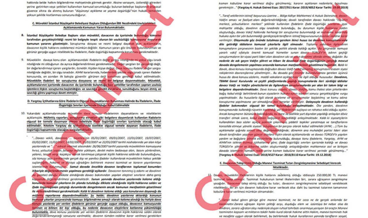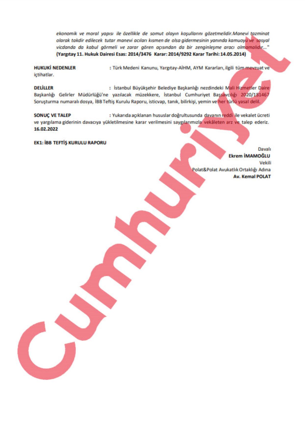 Dilekçede, "İmamoğlu'nun İstanbul Büyükşehir Belediyesi Başkanı olduğundan İBB nezdindeki usulsüzlükleri açıklamasında kamunun yararı bulunmaktadır" ifadeleri dikkat çekerken "İstanbul Büyükşehir Belediye Başkanı olan müvekkil, davacının da içerisinde bulunduğu kimseler tarafından gerçekleştirildiği resmi bir belgeyle tespit olunan bir usulsüzlüğü kamuoyuna duyurarak kamunun yararını gözetmiştir" denildi.
