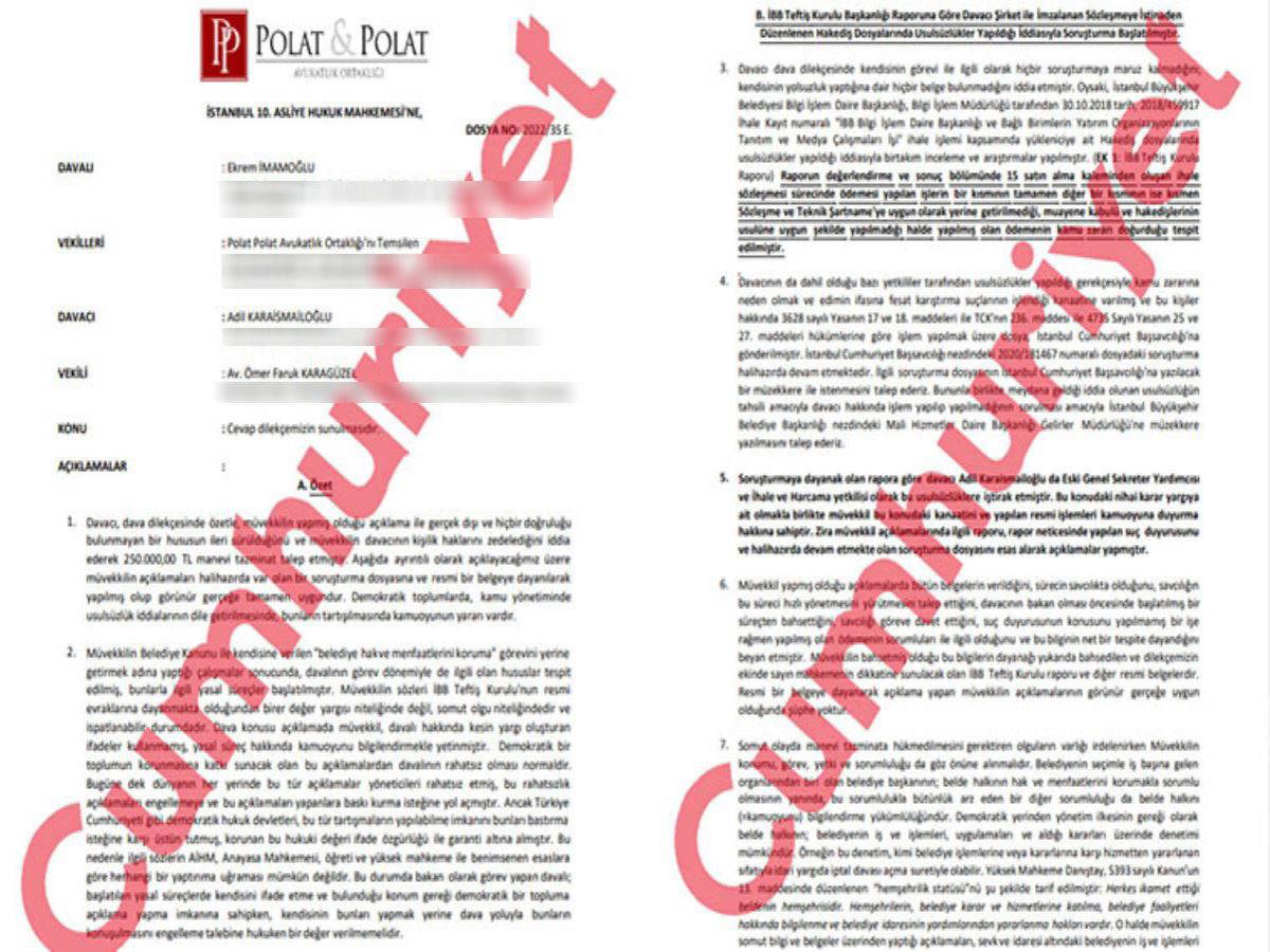 İmamoğlu'nun avukatı Kemal Polat aracılığıyla sunulan cevap dilekçesinde "Müvekkilin açıklamaları halihazırda var olan bir soruşturma dosyasına ve resmi bir belgeye dayanılarak yapılmış olup görünür gerçeğe tamamen uygundur. Demokratik toplumlarda, kamu yönetiminde usulsüzlük iddialarının dile getirilmesinde, bunların tartışılmasında kamuoyunun yararı vardır" denildi.