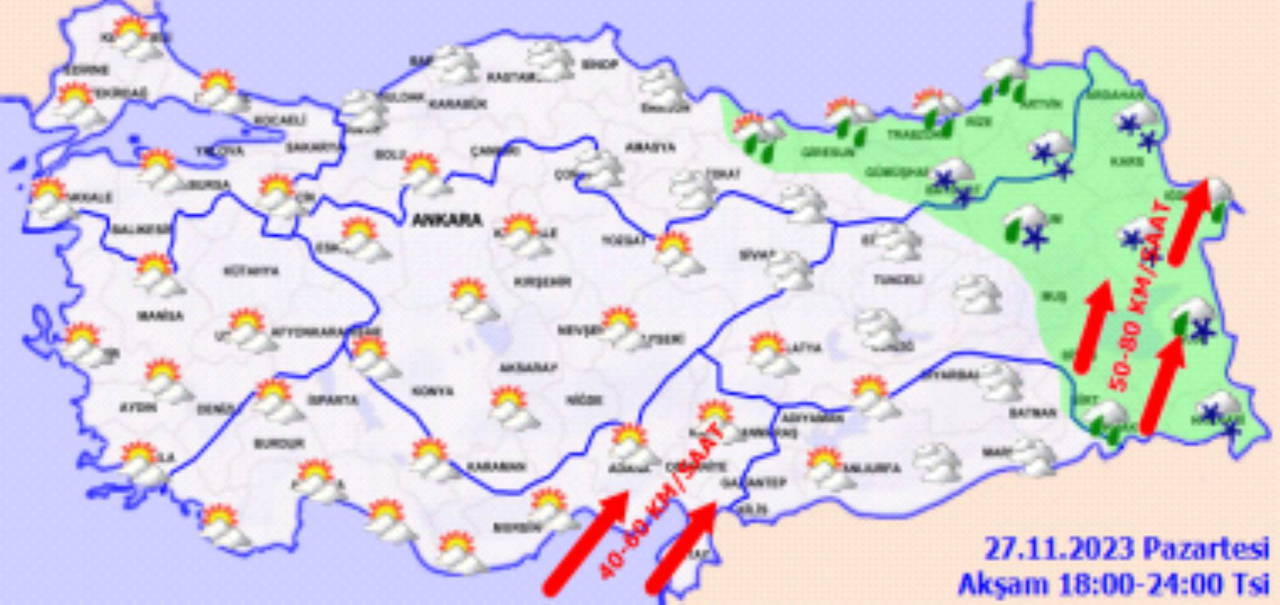 Rüzgrın ise genellikle güneyli, zamanla iç ve batı kesimlerde batı ve kuzeybatı yönlerden, hafif ara sıra orta kuvvette, Doğu Akdeniz, Batı Karadeniz, Doğu Anadolu ile Güneydoğu Anadolu'nun batı ve kuzeydoğusunda kuvvetli ve zaman zaman kısa süreli fırtına (40-70 km/saat hamleli 80-100 km/saat) şeklinde bekleniyor.