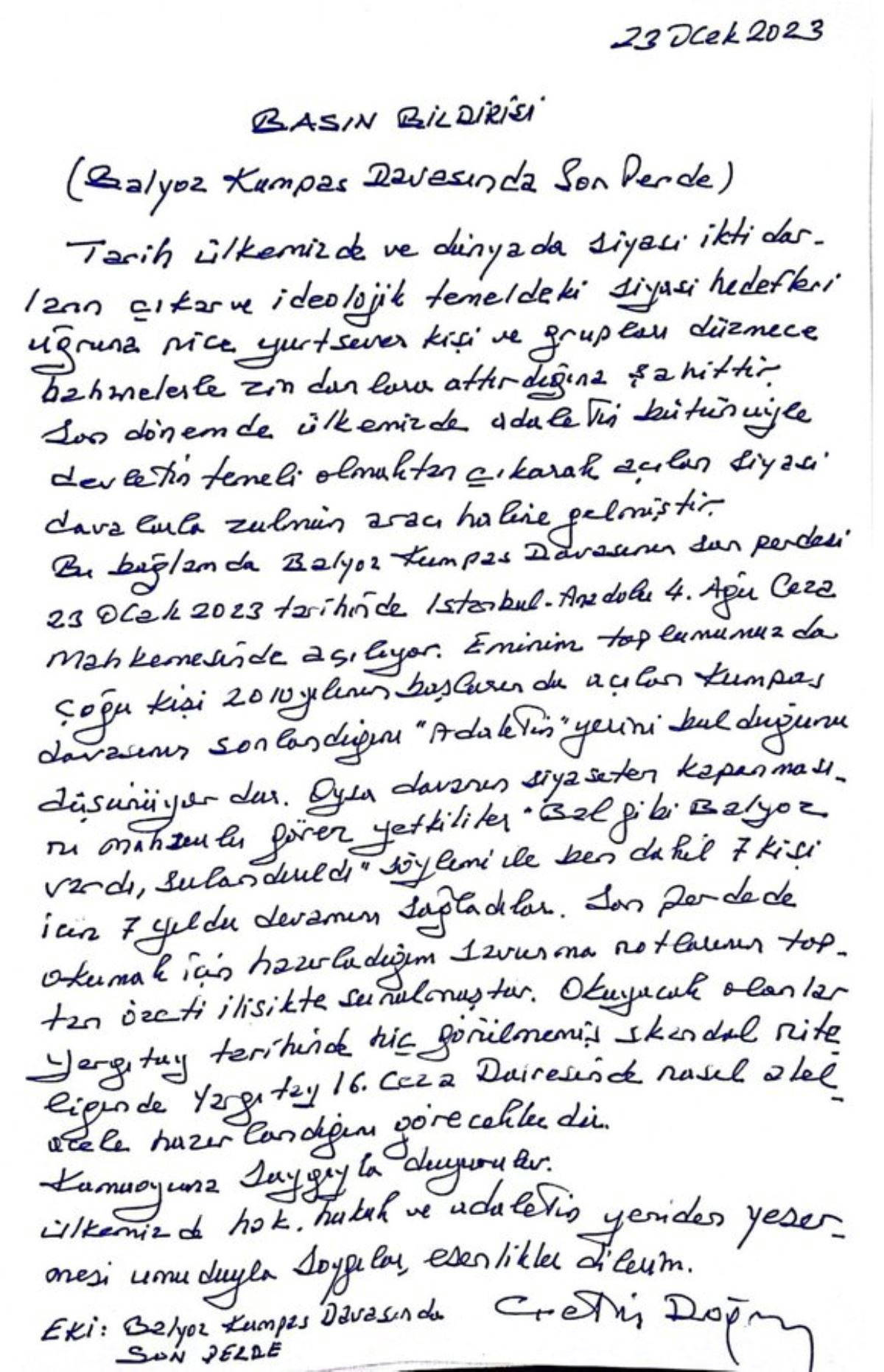 23 Ocak 2023, İzmir 1 Nolu F Tipi Yüksek Güvenlikli Kapalı Ceza İnfaz Kurumu'ndan gönderilen "Balyoz Kumpas Davası’nda Son Perde” başlıklı metinde, "Tarih ülkemizde ve dünyada siyasi iktidarların çıkar ve ideolojik temeldeki siyasi hedefleri uğruna nice yurtsever kişi ve grupları düzmece bahanelerle zindanlara attırdığına şahittir" denildi.
