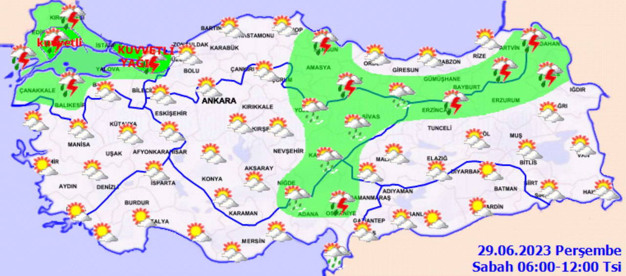 Yağışların sabah saatlerinde Tekirdağ, İstanbul'un kuzey ve doğu kesimleri, Kocaeli ve Sakarya çevrelerinde, öğle saatlerinden sonra Sakarya, Zonguldak, Düzce ve Bartın çevrelerinde, gece saatlerinde Samsun çevrelerinde yer yer kuvvetli olması bekleniyor.