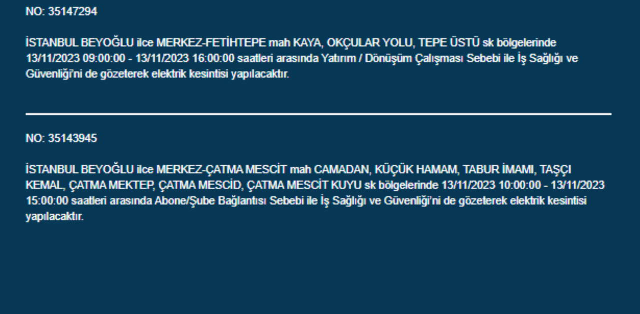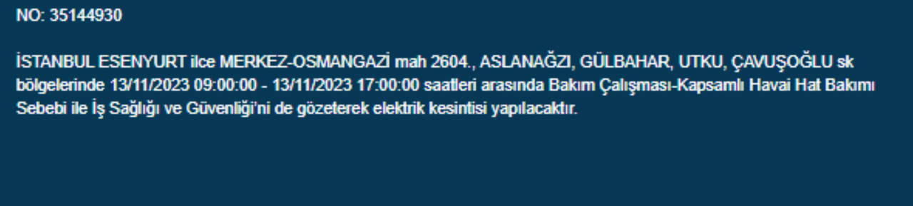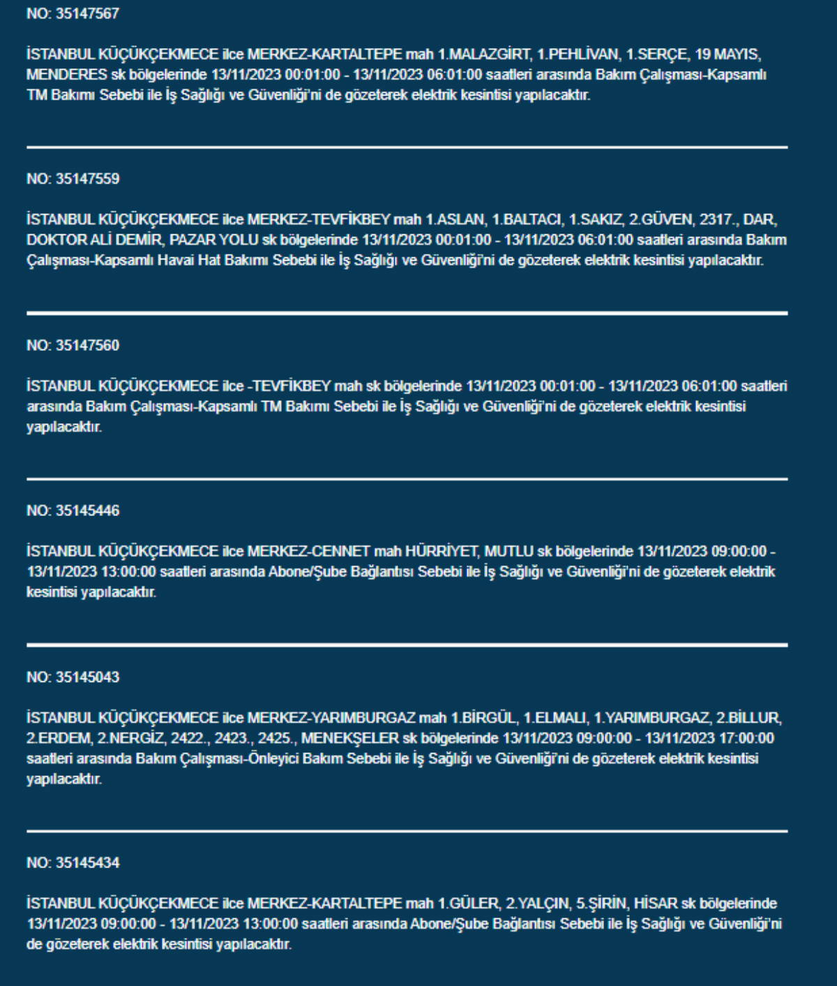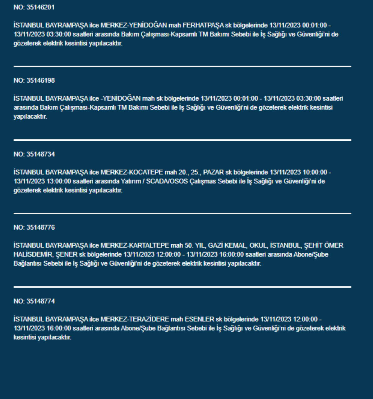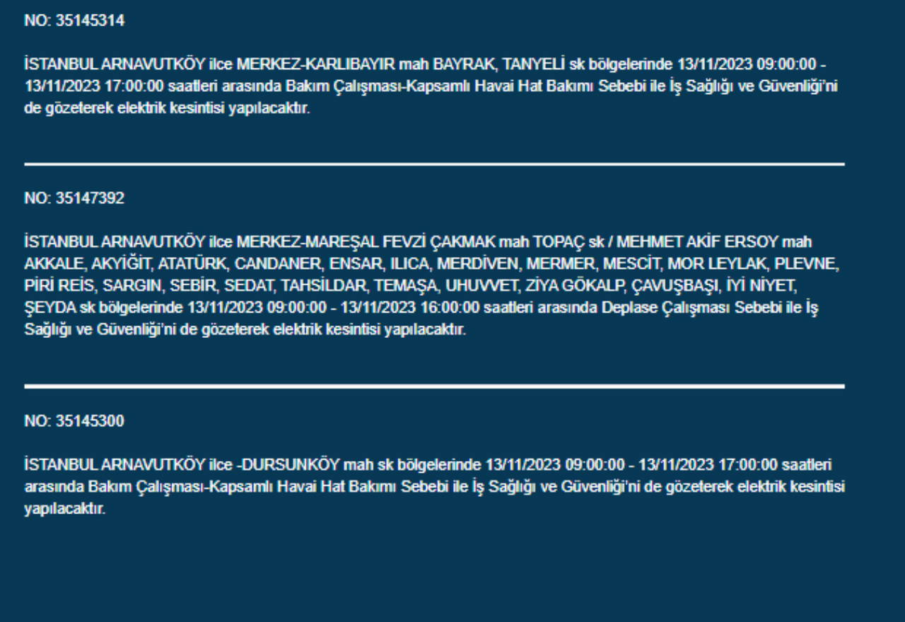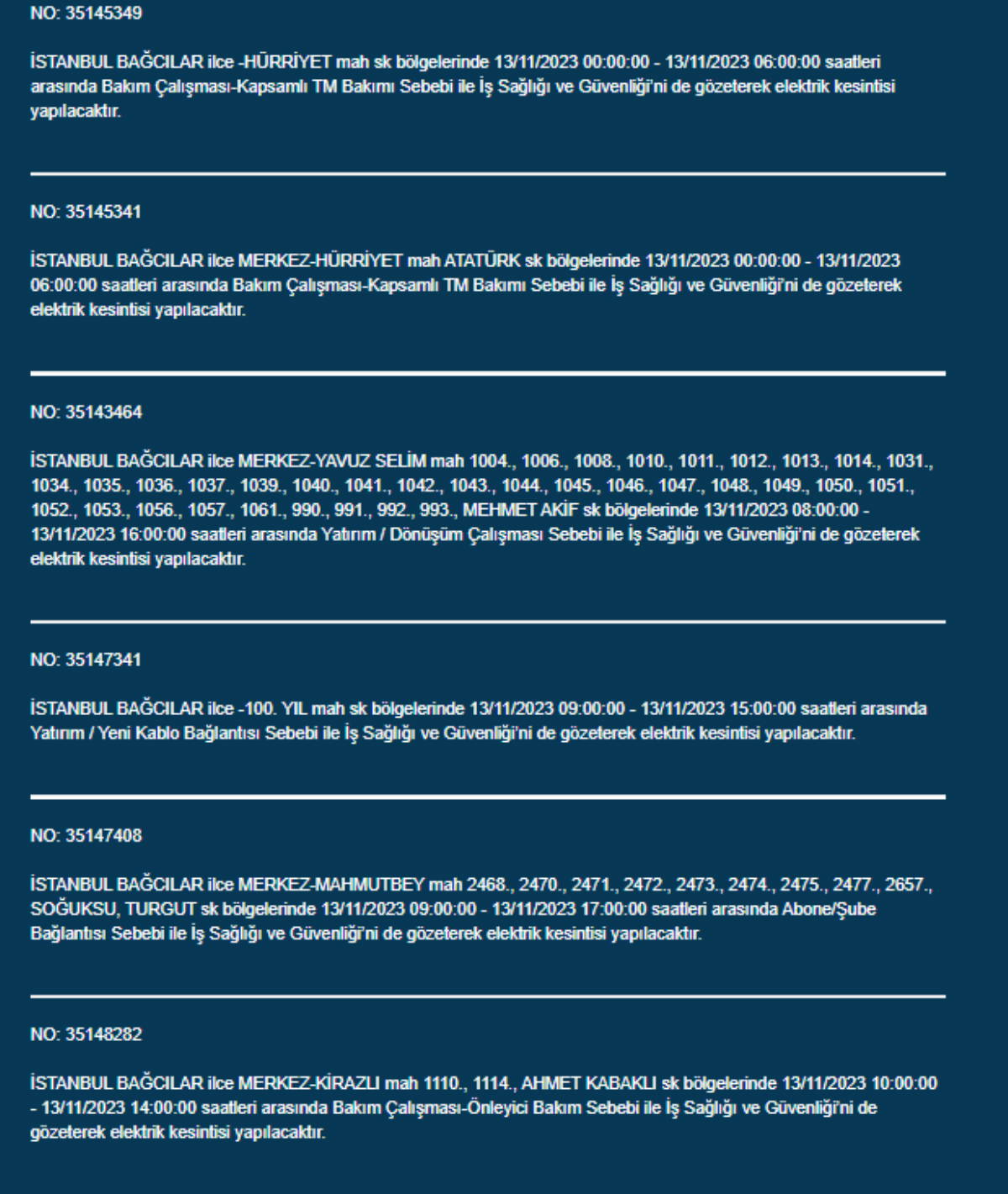 İstanbullulara elektrik sağlayan BEDAŞ ve AYEDAŞ, resmi sitesi üzerinden en az 35 ilçede anlık ve uzun süreli bakım çalışmalarından dolayı elektrik kesileceğini duyurdu. Peki, İstanbul'da bugün elektrik kesintisi yaşanacak ilçeler neler? 13 Kasım İstanbul'da elektrik ne zaman gelecek?