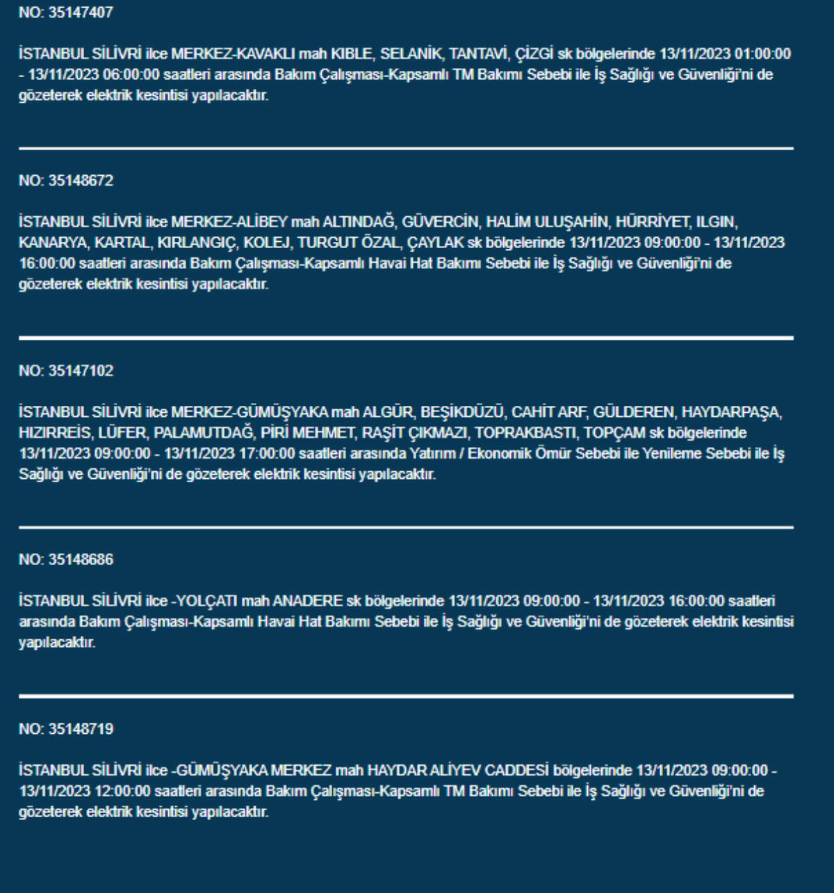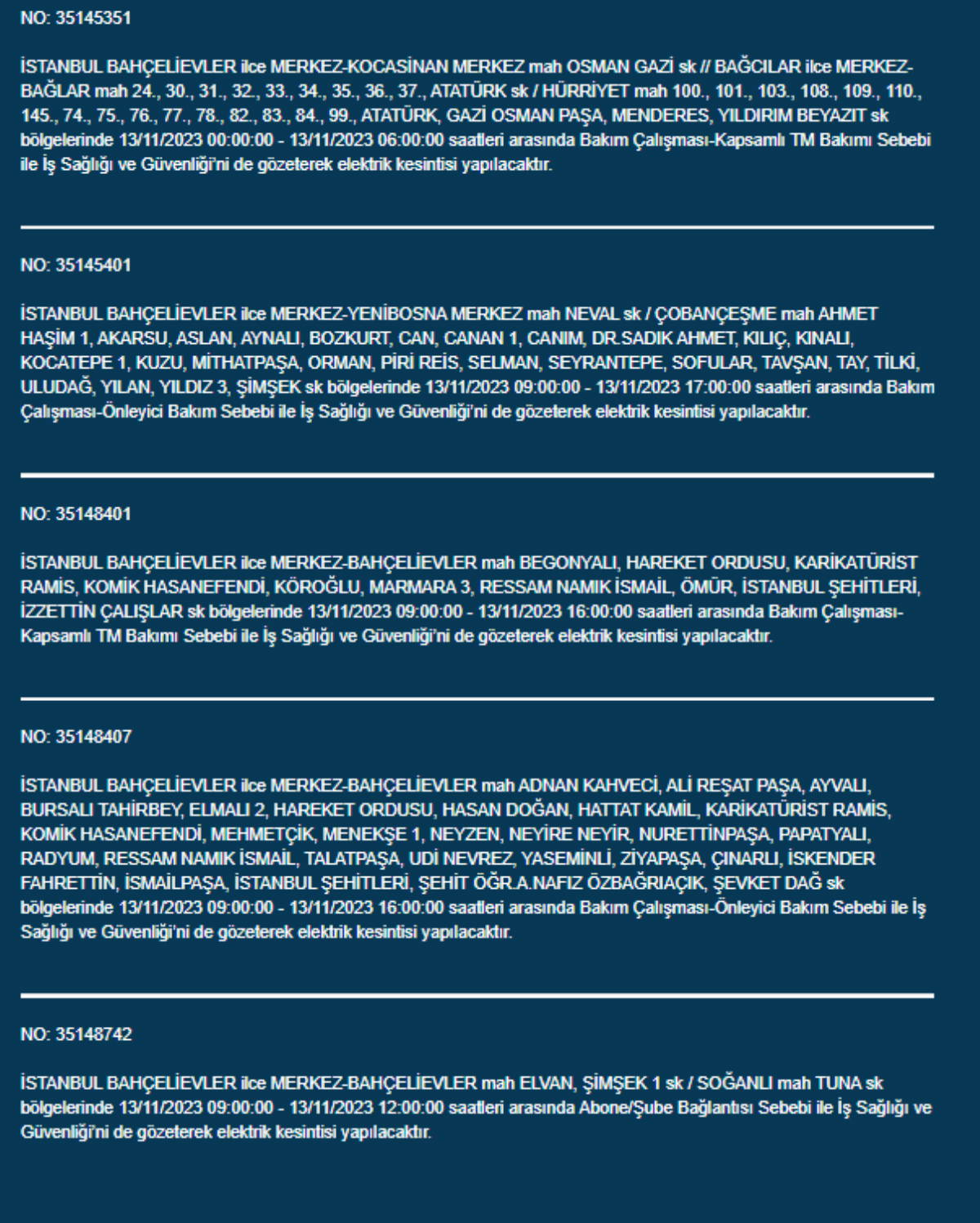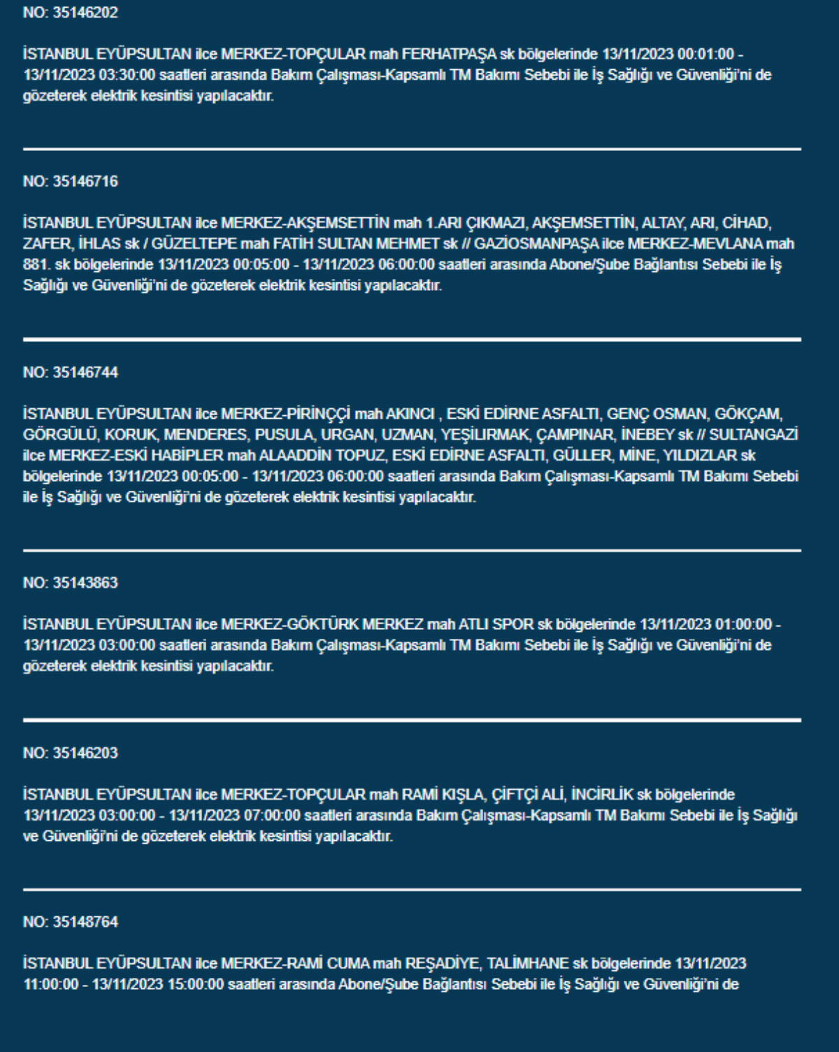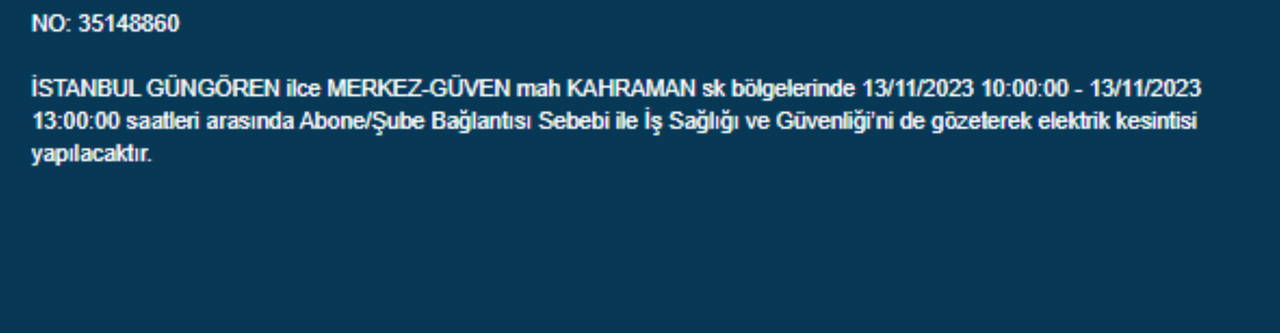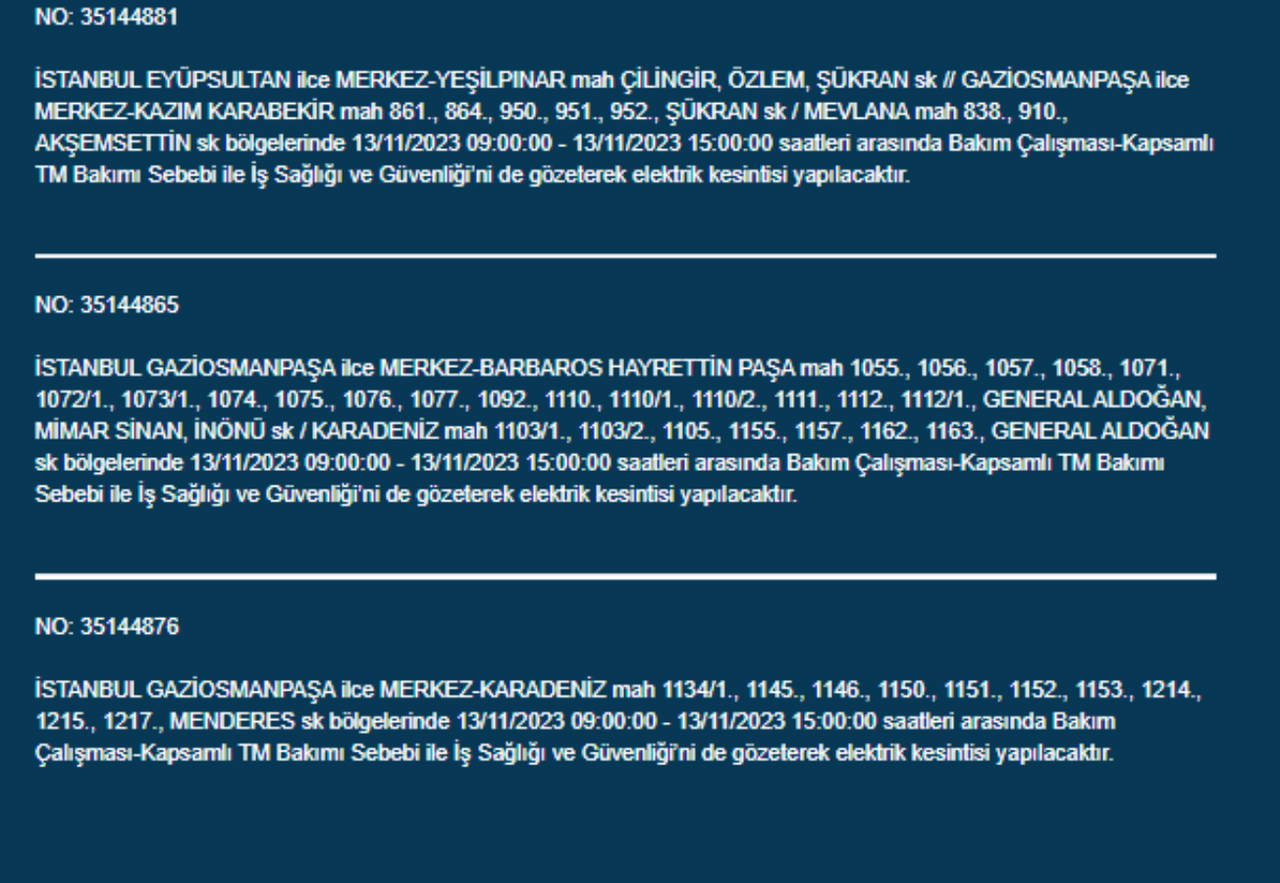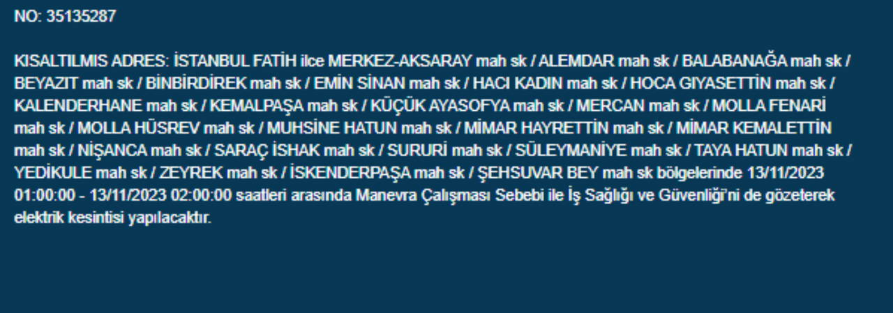 İstanbullulara elektrik sağlayan BEDAŞ ve AYEDAŞ, resmi sitesi üzerinden en az 35 ilçede anlık ve uzun süreli bakım çalışmalarından dolayı elektrik kesileceğini duyurdu. Peki, İstanbul'da bugün elektrik kesintisi yaşanacak ilçeler neler? 13 Kasım İstanbul'da elektrik ne zaman gelecek?