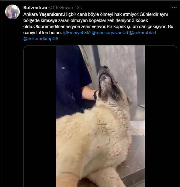 Köpek, kendisini sokakta besleyen Arzu Mermerci'nin evinin önüne giderek yere yığıldı. Mermerci, ikinci kez zehirlenen köpeği kliniğe götürdü. Klinikte tedavi altına alınan köpeğin kurtulma şansının az olduğu belirtildi.
