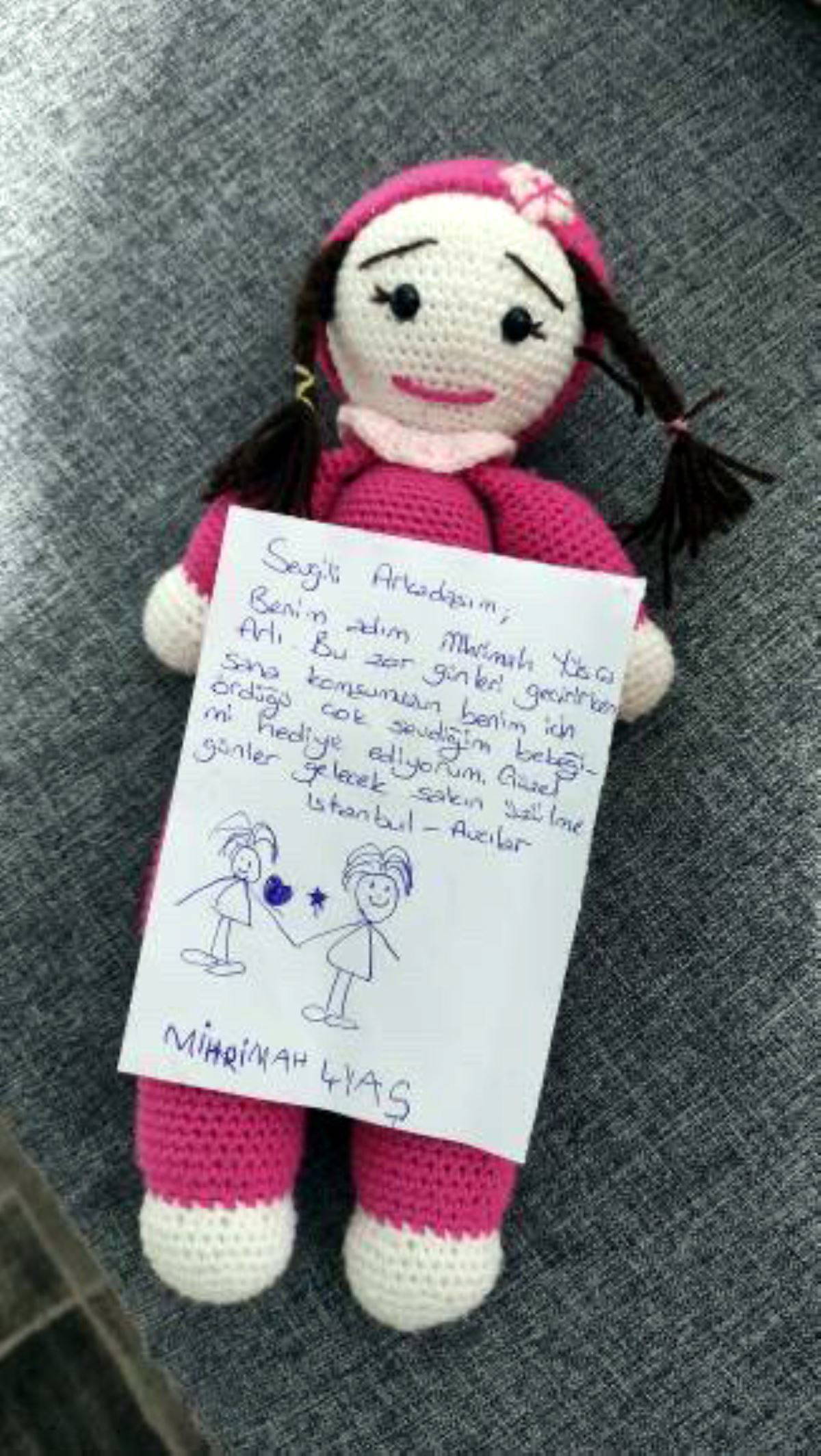 Mihrimah Yüsna Arlı, depremde evleri yıkılanlara çok üzüldüğünü onlar için dua ettiğini, oyuncağının ulaştığı çocukla bir gün görüşmeyi umduğunu ekledi.