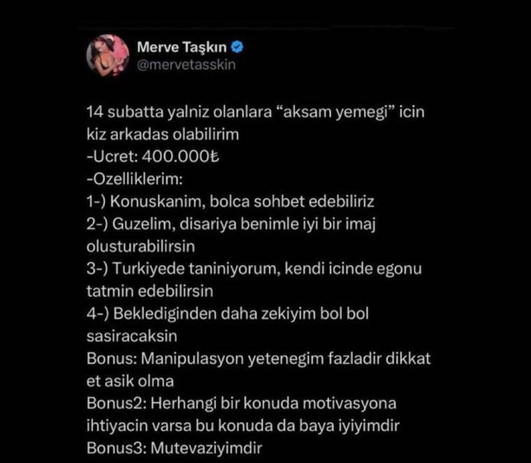 Sosyal medya hesabından bir ilan yayınlayan Merve Taşkın, 14 Şubat'ta yalnız olanlar için ücret karşılığında akşam yemeği teklif etti ve 400 bin TL de ücret belirledi.