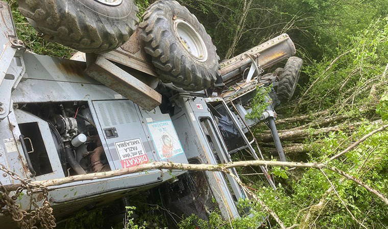 Orman yolu kenarında kanal temizleme çalışması yapan Samet Barış Taşkın’ın kullandığı Ulus Orman İşletme Müdürlüğü’ne ait iş makinesi, 50 metreden yuvarlandı.