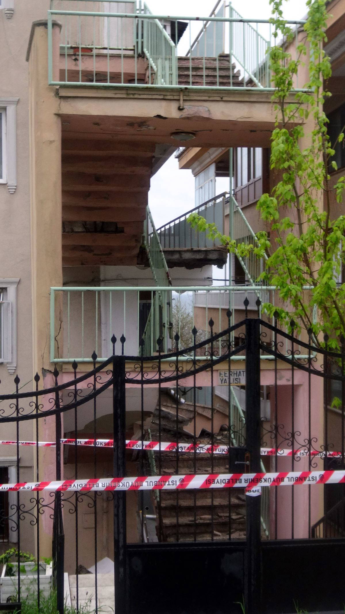 Binanın girişine emniyet şeridi çekilerek güvenlik önlemi alındı. Merdivenlerin bir bölümünün yıkılmasının ardından 3 basamağı havada asılı kaldı.
