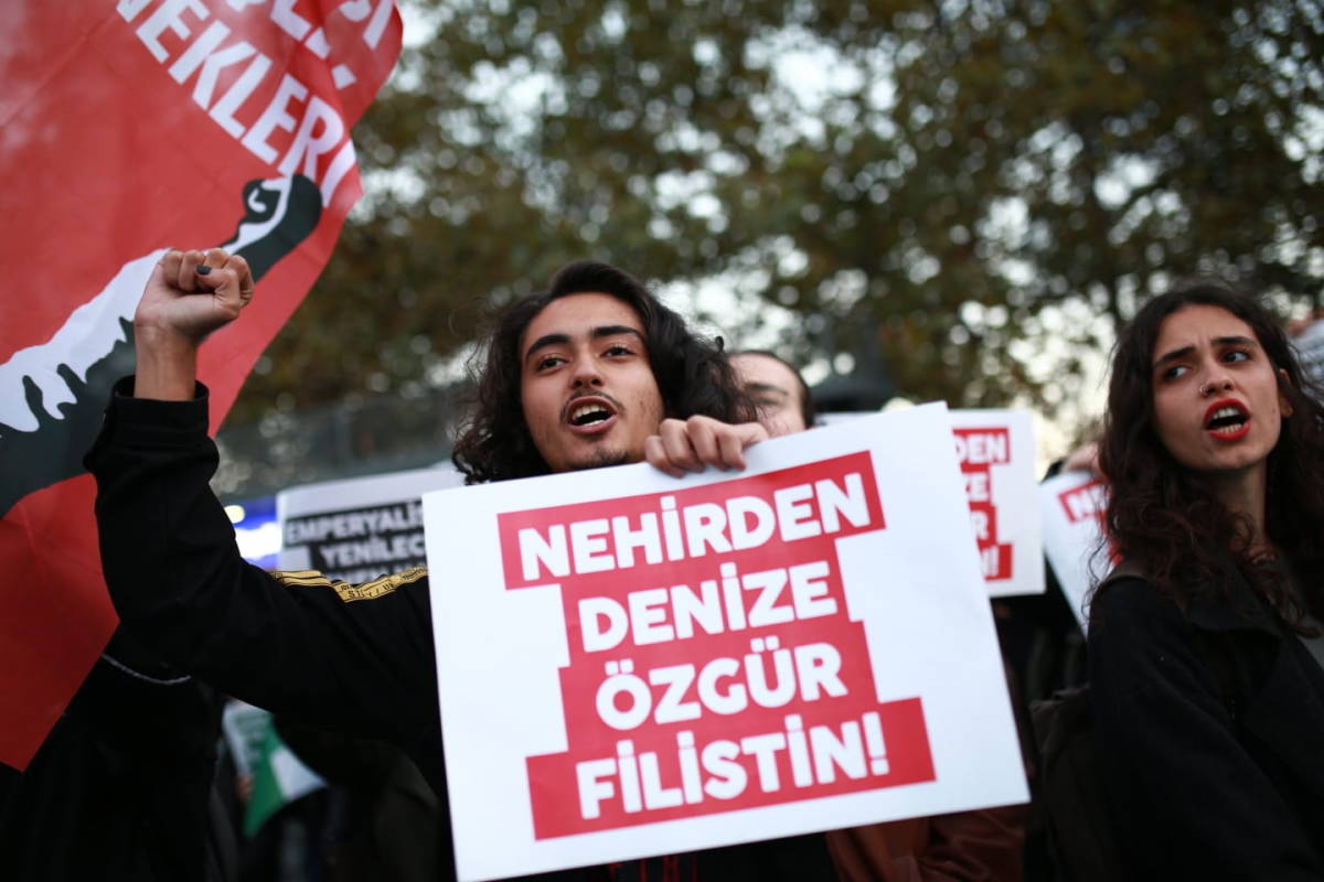 Fındıklı'dan başlatılan yürüyüşte Filistin bayrağı da açan gençler "Katil İsrail işbirlikçi AKP" "Tanka karşı taş, Filistin'de taş atan çocuklara bin selam" ve "Kahrolsun siyonizm kahrolsun emperyalizm" sloganları attı.