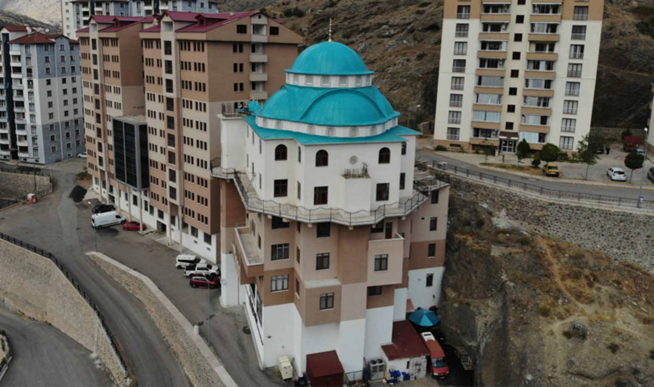 Gümüşhane’nin Oltanbey mahallesinde yapımına 2014 yılında başlanan ve mahallenin kayalık arazisi ve yer sıkıntısı nedeniyle 5 kat üzerine inşa edilen cami mimarisiyle görenleri şaşırtıyor.
