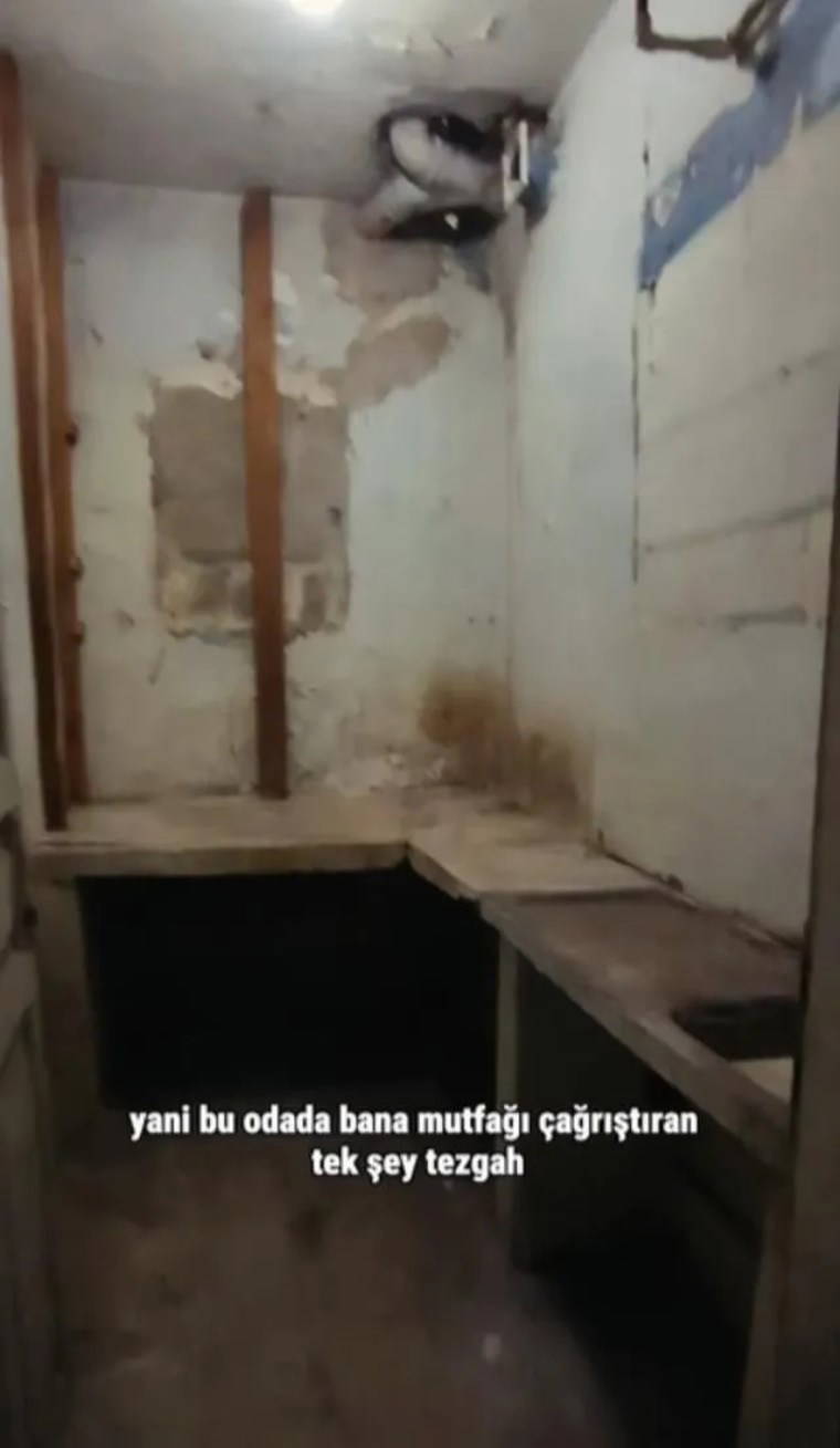 Daha sonrasında evi gezmeye devam eden sosyal medya kullanıcısı "Burası bir odamı ondan bile emin değilim. Mutfağa benzettiğim bir şey göstereceğim. Bu odada bana mutfağı çağrıştıran tek şey tezgah. Onun altı da maalesef çok sağlam gözükmüyor. Acaba bir insan eli değse pırıl pırıl olur mu diye düşündüğüm bu odanın gerçekten depo olarak kullanılması daha sağlıklı gibi. Bu bölümün ne olduğunu mülk sahibi de anlamadı. Ardiye ya da kiler olarak kullanabilirmiş" diye konuştu.