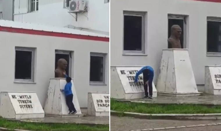 Atatürk büstünü sildikten sonra çocuk, bu kez üzerinde Mustafa Kemal Atatürk’ün sözü olan ‘Vatan Bir Bütündür Parçalanamaz’ ve ‘Ne Mutlu Türküm Diyene’ yazılarını sildi.