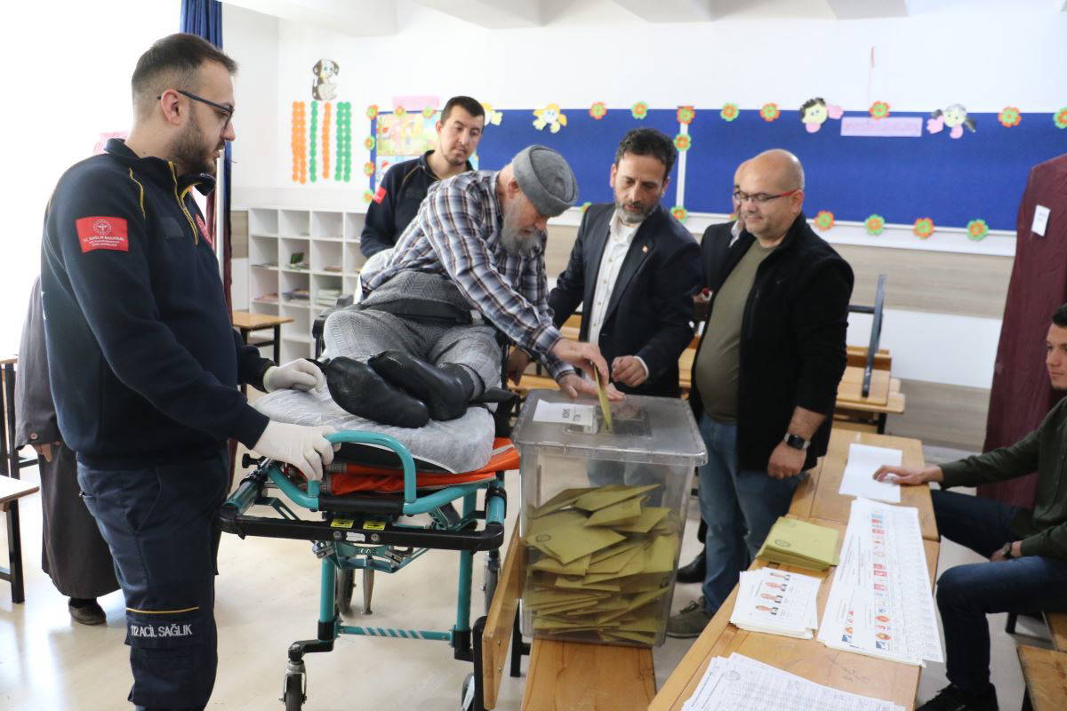 Sağlık ekipleri tarafından sedyede oy kullanmak için Ahmet Olcay İlkokulu’na getirilen 87 yaşındaki Mustafa Uzun, 1293 numaralı sandıkta oyunu kullandı.