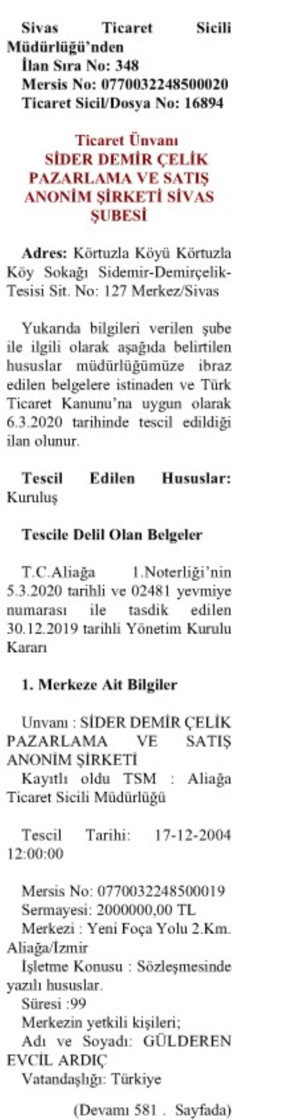 Sivas 3. Asliye Hukuk Mahkemesi’nin 27/02/2020 tarih 2019/468 esas ve 2020/144 karar sayılı ilamı ile iflasına karar verilen SİDEMİR Sivas Demir Çelik A.Ş; SİDER Demir Çelik Pazarlama ve Satış A.Ş'ye kiraya verilmişti.