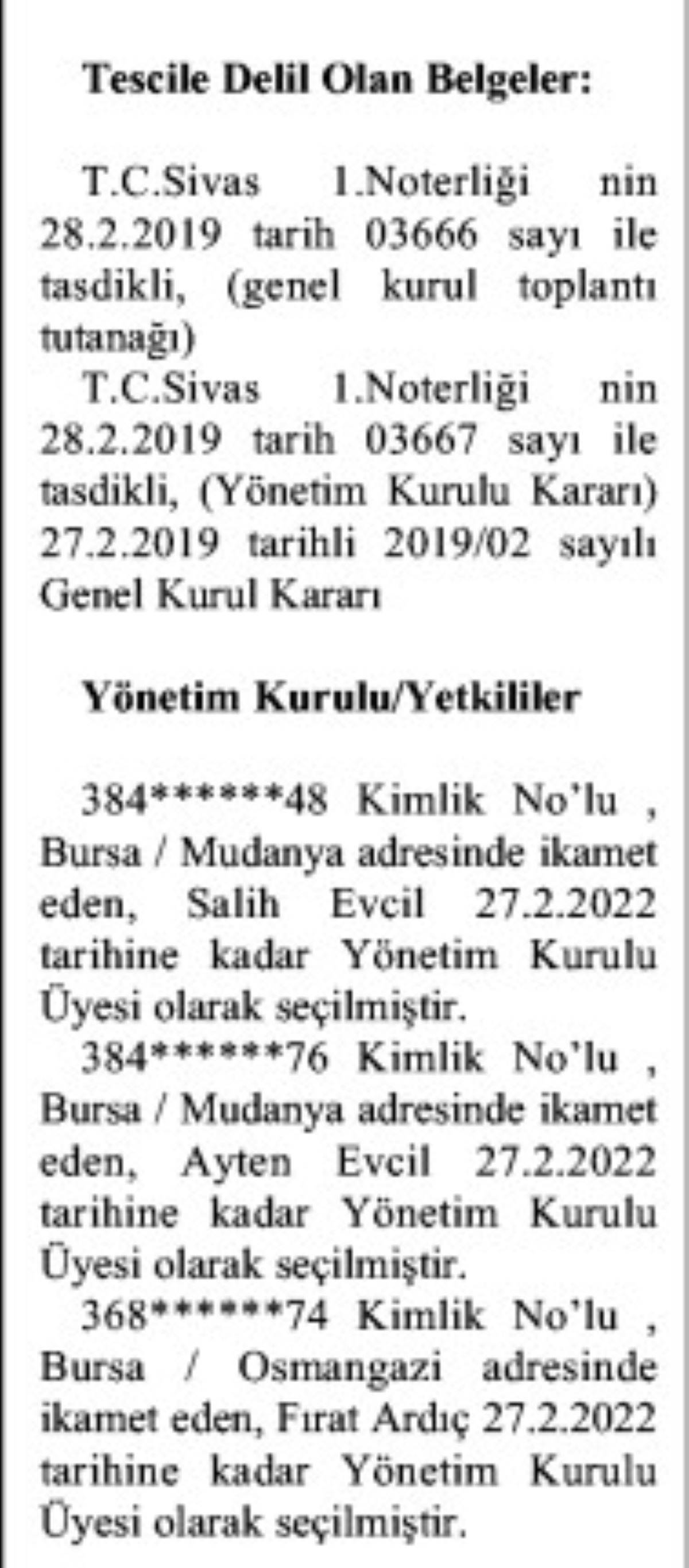 İki işletmenin adreslerinin aynı olmasının yanı sıra Türkiye Ticaret Sicil Gazetesi'nde yer alan bilgiler de şirketler arasındaki organik bağı gözler önüne seriyor. SİDEMİR'in iflasından önceki yönetiminde Salih Evcil, Ayten Evcil ve Fırat Ardıç bulunuyor.