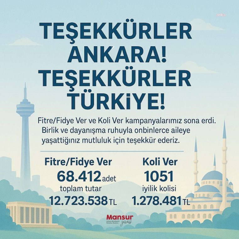 ABB Başkanı Mansur Yavaş’ın “Gelin, fitrelerinizle bir sofraya umut, bir aileye huzur olalım” çağrısıyla başlatılan kampanyalar, on binlerce aileye ulaşarak dayanışma ruhunu büyüttü. Kampanyalar ile 14 milyon 2 bin 20 TL’lik toplam yardım tutarıyla ihtiyaç sahiplerine destek olundu.