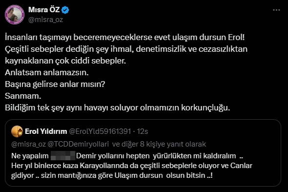 Öz, "İnsanları taşımayı beceremeyeceklerse evet ulaşım dursun Erol! Çeşitli sebepler dediğin şey ihmal, denetimsizlik ve cezasızlıktan kaynaklanan çok ciddi sebepler. Anlatsam anlamazsın. Başına gelirse anlar mısın? Sanmam. Bildiğim tek şey aynı havayı soluyor olmamızın korkunçluğu" ifadelerini kullandı.