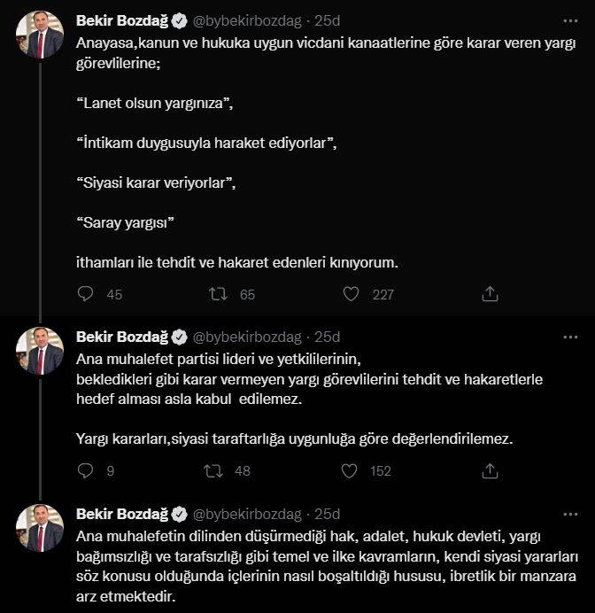 Ana muhalefetin dilinden düşürmediği hak, adalet, hukuk devleti, yargı bağımsızlığı ve tarafsızlığı gibi temel ve ilke kavramların, kendi siyasi yararları söz konusu olduğunda içlerinin nasıl boşaltıldığı hususu, ibretlik bir manzara arz etmektedir. Ana muhalefet partisi lideri ve yetkililerinin, bekledikleri gibi karar vermeyen yargı görevlilerini tehdit ve hakaretlerle hedef alması asla kabul edilemez. Yargı kararları, siyasi taraftarlığa uygunluğa göre değerlendirilemez.