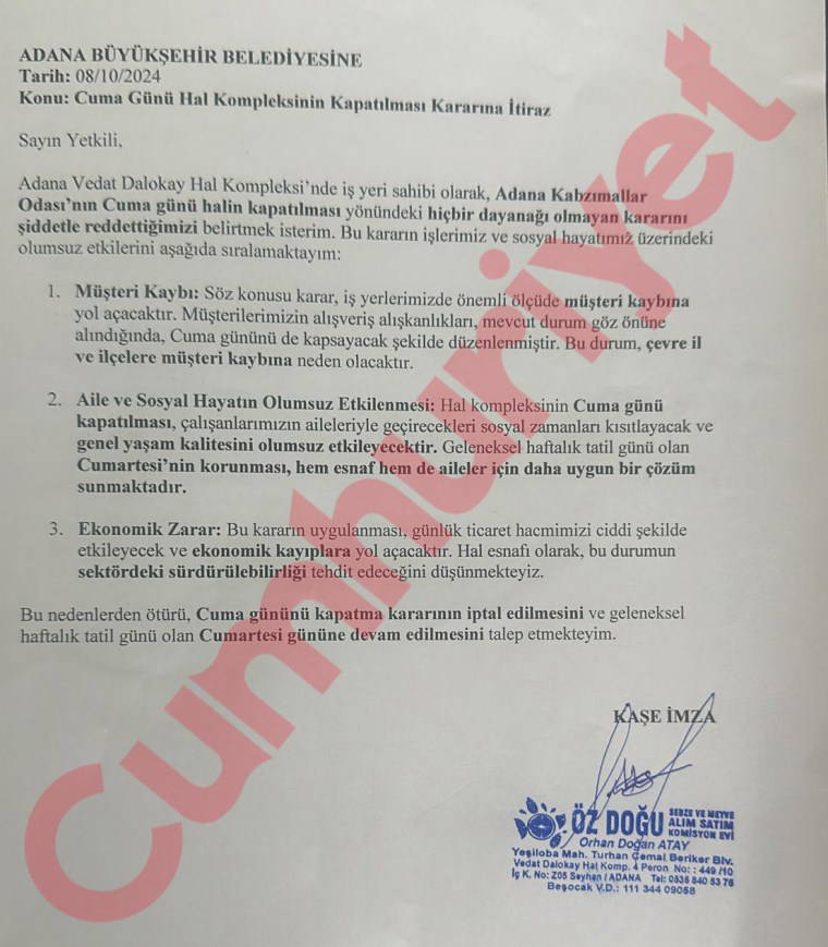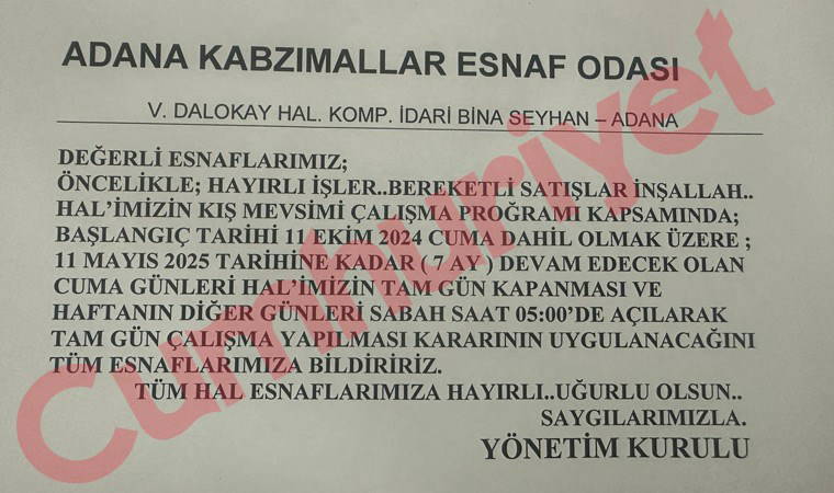 Adana Kabzımallar Esnaf Odası, 11 Ekim tarihinden itibaren cuma günleri halin kapatılmasına karar verdi.