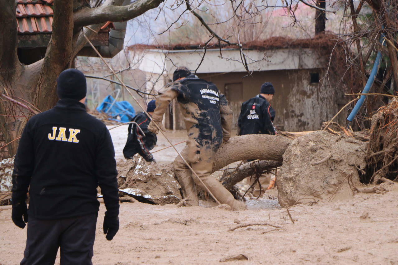 Dere yatağı kenarı ve sel sularının çekilmesiyle oluşan balçık alanlarda eğitimli köpekler ile arama çalışmaları yapılırken, dalgıç polisler ise dere boyunda su içerisinde anne ve kızını bulmaya çalışıyor.
