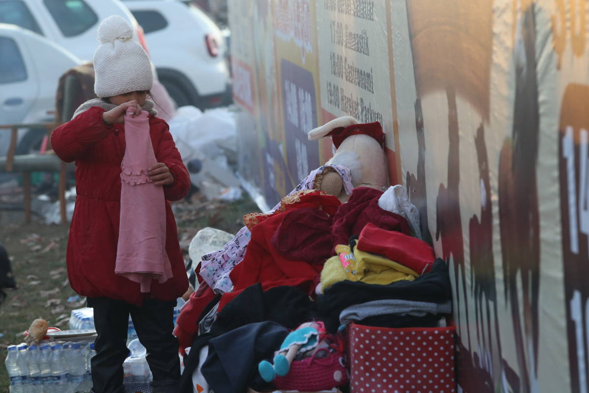 “Beton yığınına” dönmüş sekiz katlı bir binanın önünde küçük bir kız karşılıyor bizi. Önünde çocuk kıyafetleri ve oyuncaklar var. Enkaz altında can veren aynı yaştaki kuzeninin oyuncaklarını ve kıyafetlerini diziyor özenle. İzleyenler ağlayarak şöyle sesleniyor: “Yapma be çocuğum, dağlama yüreğimizi...”
