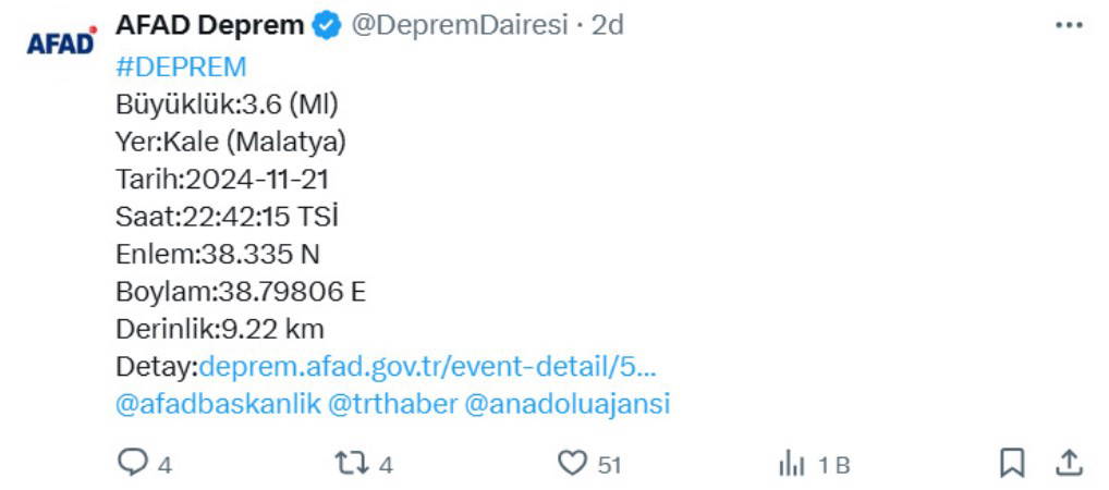 AFAD (Afet ve Acil Durum Yönetimi Başkanlığı), Malatya'nın Kale ilçesinde 3.6 büyüklüğünde deprem meydana geldiğini açıkladı.