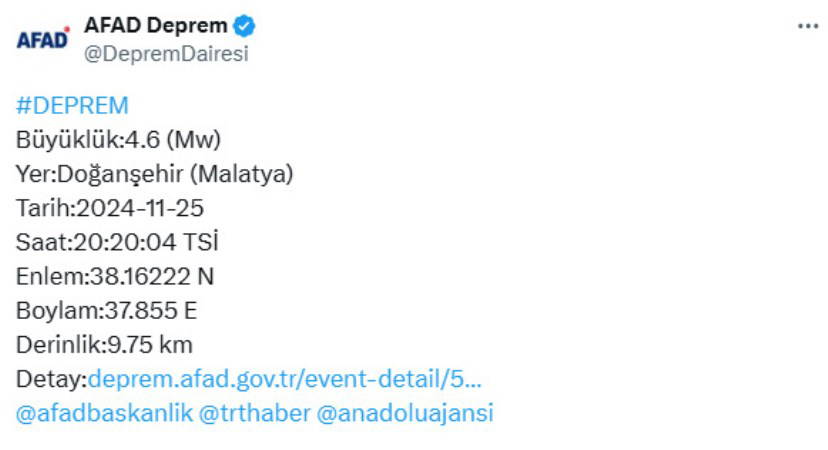 "Malatya Doğanşehir’de 4.6 büyüklüğünde meydana gelen ve çevre illerden de hissedilen depremle ilgili olarak AFAD ve ilgili kurumlarımızın tüm ekipleri saha taramalarına derhal başlamıştır.