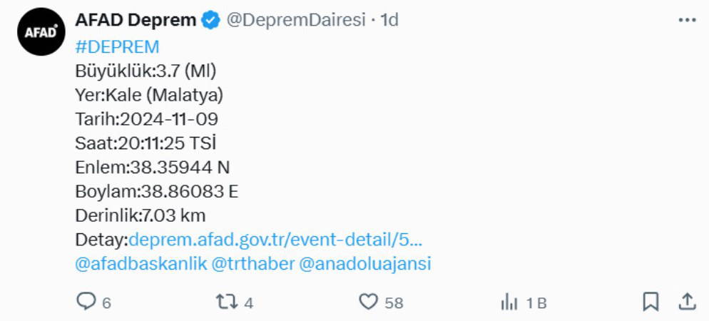 Afet ve Acil Durum Yönetimi Başkanlığı (AFAD), Malatya'nın Kale ilçesinde 3.7 büyüklüğünde deprem meydana geldiğini açıkladı.