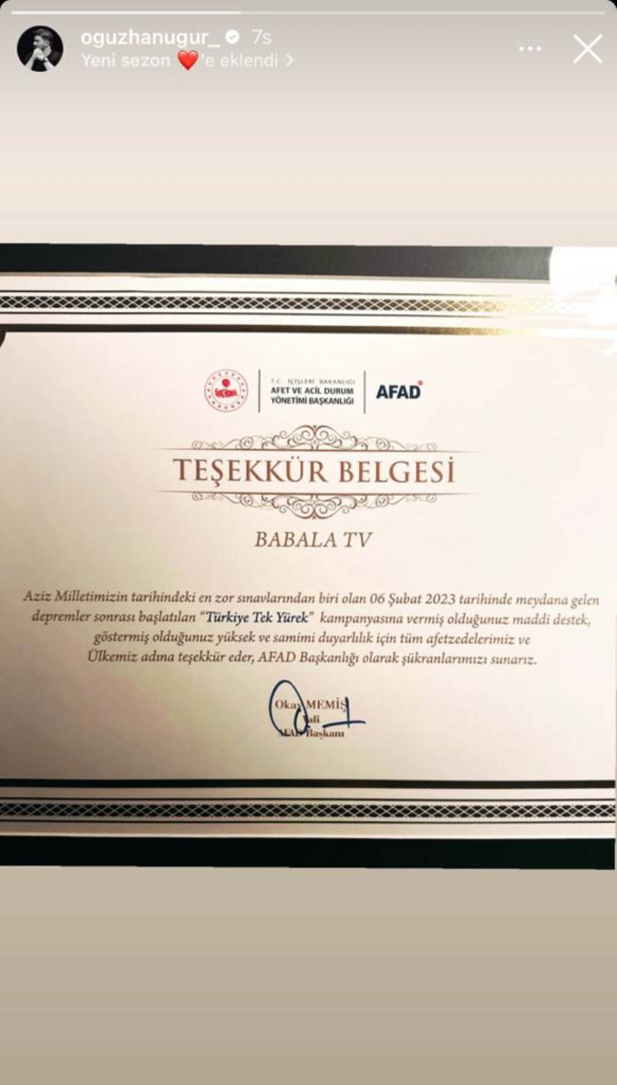 BaBaLa TV'ye verilen teşekkür belgesinde AFAD'ın, "Aziz Milletimizin tarihindeki en zor sınavlarından biri olan 06 Şubat 2023 tarihinde meydana gelen depremler sonrası başlatılan "Türkiye Tek Yürek" kampanyasına vermiş olduğunuz maddi destek, göstermiş olduğunuz yüksek ve samimi duyarlılık için tüm afetzedelerimiz adına ülkemiz adına teşekkür eder, AFAD Başkanlığı olarak şükranlarımızı sunarız" notu yer aldı.