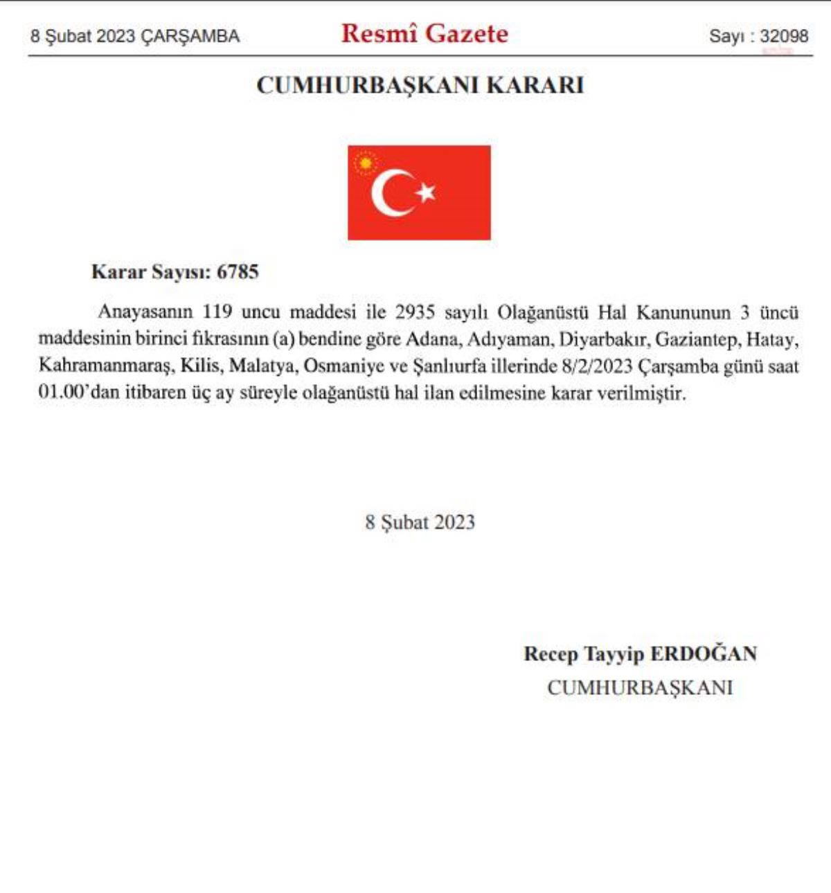 10 ilde bugün saat 01.00'den itibaren 3 ay süreyle olağanüstü hal ilan edilmesine ilişkin Cumhurbaşkanı Kararı Resmi Gazete'de yayımlandı.