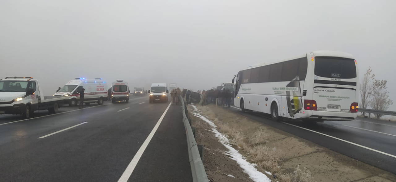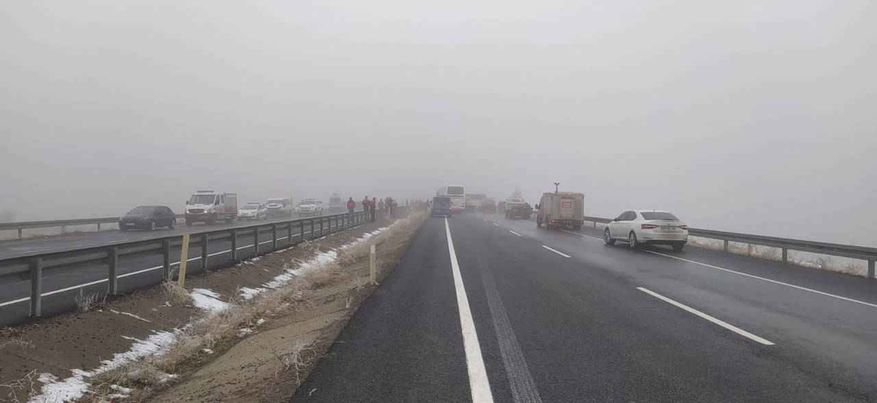 Ağrı-İran kara yolu Yoncalı köyü mevkisinde, saat 08.00 sıralarında yoğun sis ve buzlanma nedeni ile aralarında otobüs, midibüs, hafif ticari araç ve otomobilin bulunduğu 9 araç, zincirleme kazaya karıştı.