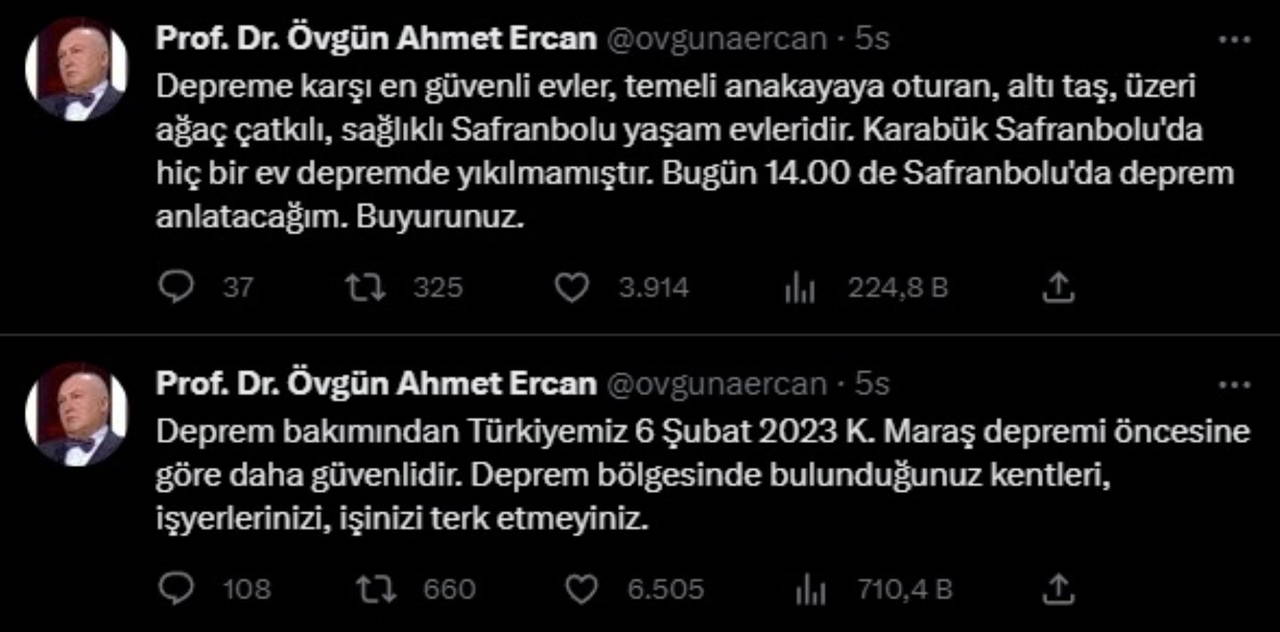 Öte yandan Ercan, "Deprem bakımından Türkiyemiz 6 Şubat 2023 Kahramanmaraş depremi öncesine göre daha güvenlidir. Deprem bölgesinde bulunduğunuz kentleri, işyerlerinizi, işinizi terk etmeyiniz" ifadelerini kullandı.