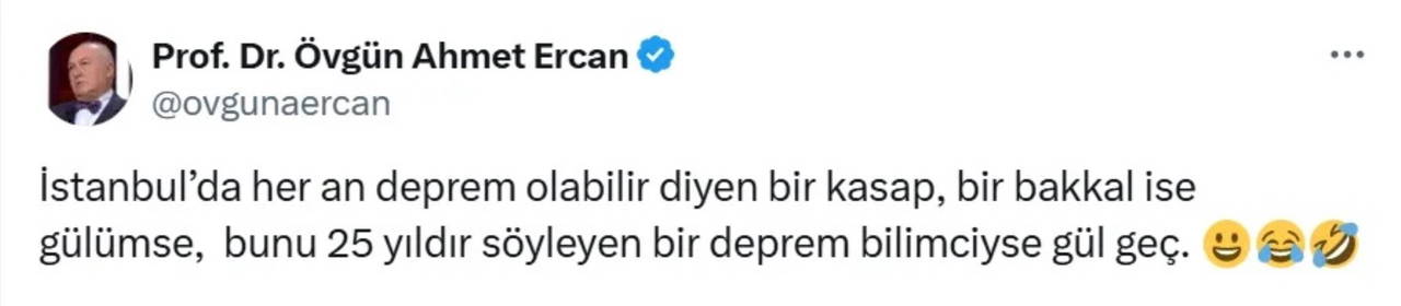 Ercan, X paylaşımında “İstanbul’da her an deprem olabilir diyen bir kasap, bir bakkal ise gülümse, bunu 25 yıldır söyleyen bir deprem bilimciyse gül geç” ifadelerini kullandı.