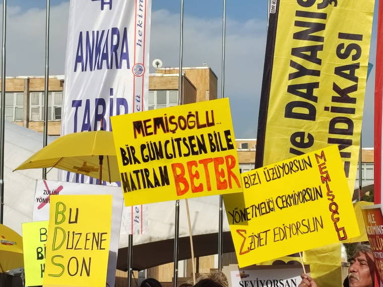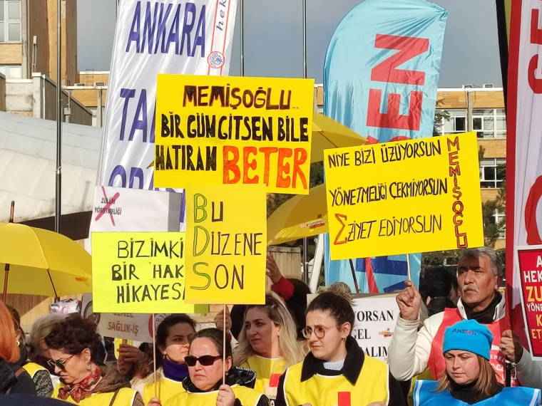 Sağlıkçılar ellerindeki "Memişoğlu bir gün gitsen bile hatıran beter", "Niye bizi üzüyorsun, yönetmeliği çekmiyorsun, eziyet ediyorsun Memişoğlu?" dövizleriyle birlikte "Birleşe birleşe kazanacağız", "Bakan istifa" sloganları attı. Sağlık emekçileri burada bir açıklama yaptı. Açıklamayı Ankara Tabip Odası (ATO) Başkanı Dr. Mine Coşkun okudu.
