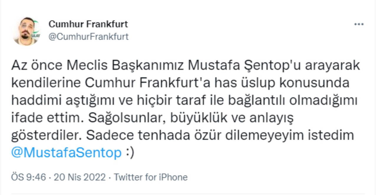 Sözkonusu hesaptan yapılan paylaşımda "Az önce Meclis Başkanımız Mustafa Şentop'u arayarak kendilerine Cumhur Frankfurt'a has üslup konusunda haddimi aştığımı ve hiçbir taraf ile bağlantılı olmadığımı ifade ettim. Sağolsunlar, büyüklük ve anlayış gösterdiler. Sadece tenhada özür dilemeyeyim istedim" denildi.