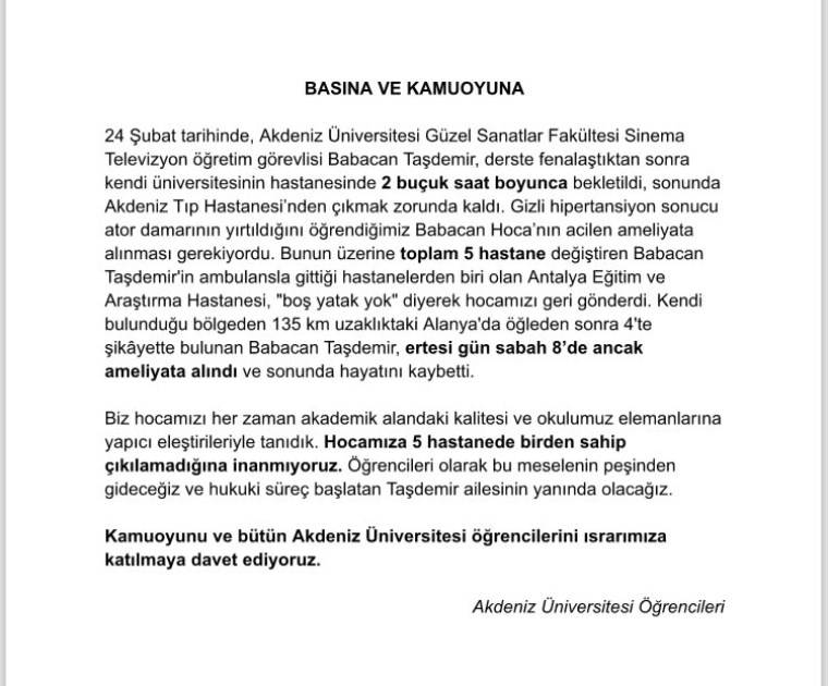 Son olarak bugün Akdeniz Üniversitesi Öğrencileri'nin yaptığı açıklama sosyal medyada dikkat çekti. Açıklamada hastanede 2,5 saat boyunca bekletildiği ve Taşdemir'in 5 hastane değiştirdiği iddia edildi.
