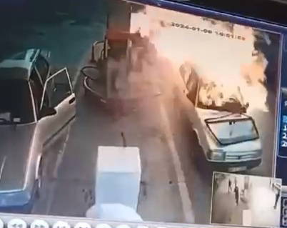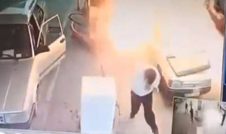 Bu sırada aracın içinde bulunan bir kişi, kıyafetleri alev almış halde kendisini dışarı attı. O anlar bir iş yerinin kamerasına yansıdı.